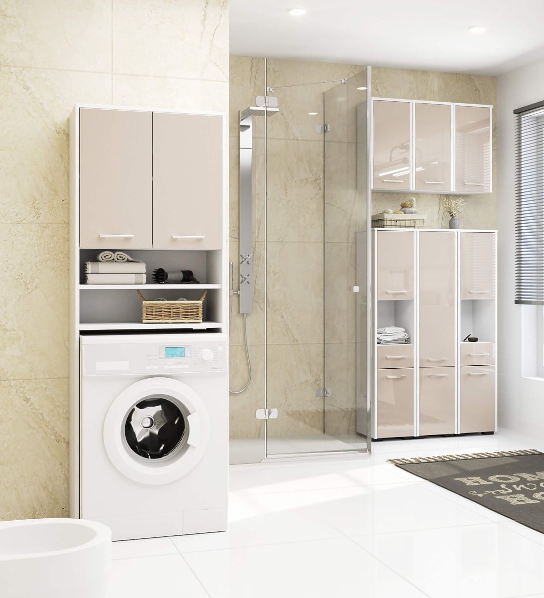 Kopalniška omarica model FIN 2D se ponaša z moderno in funkcionalno zasnovo. Izdelek je izdelan iz visokokakovostne laminirane plošče proizvajalca Kronospan debeline 16 mm, odporne proti deformacijam in obrabi. Robovi so dodatno oblepljeni z ABS trakom, ki odlično ščiti pred poškodbami. Sprednje strani so izdelane v učinkoviti barvi kapučino, ki se odlično ujema z belo konstrukcijo. Visok sijaj pohištva daje prostoru prostornost, kar je še posebej cenjeno v majhnih prostorih.