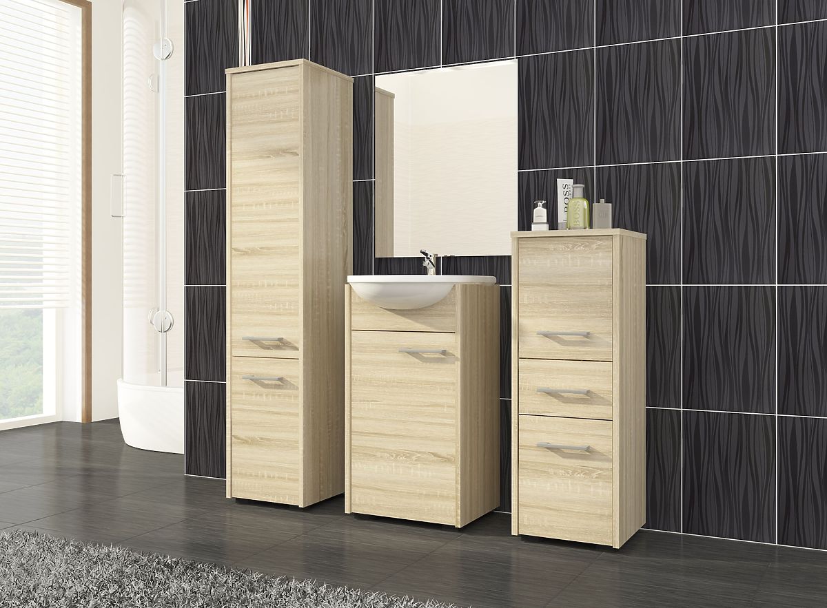Visoka kopalniška omara Fin 2 vrata je univerzalno pohištvo, ki se lahko uporablja v vsaki kopalnici, ne glede na njeno velikost. Eleganten dizajn in barva hrast sonoma zagotavljata, da omara popolnoma ustreza kopalnici v katerem koli slogu, s klasično ali moderno opremo, ter k ploščicam in keramiki v različnih odtenkih. Zaradi svojih dimenzij lahko visoka kopalniška omara zapolni pogosto neizkoriščen prostor v kotu kopalnice, prav tako pa se lahko postavi poleg umivalnika, pralnega stroja ali prhe. Stoječa kopalniška omara Fin se odlikuje po zelo skrbni izdelavi. Ima dvoje udobnih in širokih vrat z ergonomskimi ročaji, ki zagotavljajo udoben dostop do notranjosti pohištva. Globoke in prostorne police so idealne za shranjevanje brisač, toaletnih potrebščin, kozmetike ali čistilnih sredstev v omari. Visoka kopalniška omara je izdelana iz laminirane plošče, odporne proti obrabi in vodi. ABS robovi, s katerimi je omara zaključena, so trpežni, se ne razbarvajo in dodatno ščitijo omaro pred poškodbami.