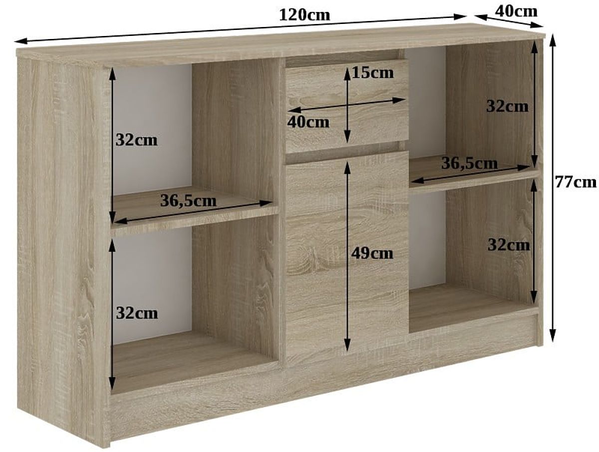 Mere pohištva so 120 cm x 77 cm x 40 cm. Vse osebe, ki iščejo privlačno, kakovostno, a tudi cenovno ugodno možnost za opremljanje prostora, vabimo k podrobnejšemu spoznavanju te zanimive ponudbe. Upamo, da bo izpolnila pričakovanja tudi najzahtevnejših oseb. Komoda je sestavljena iz dveh odprtih polic, ene za vrati in ene predalnika. Celota se lepo predstavlja samostojno ali v kombinaciji z drugim pohištvom iz te serije. Vabimo vas k nakupu.