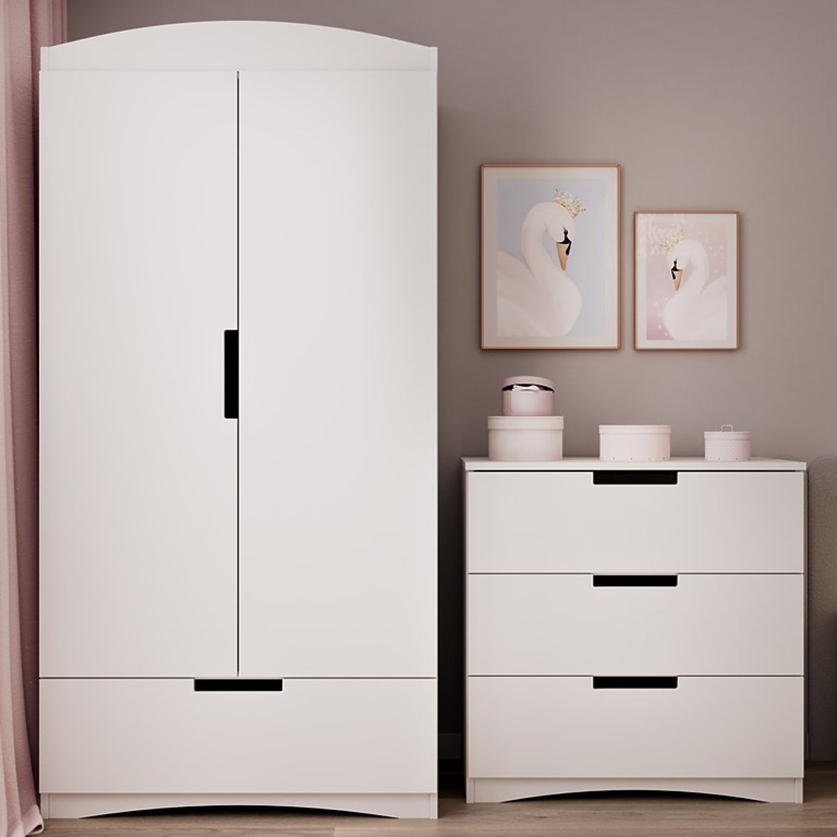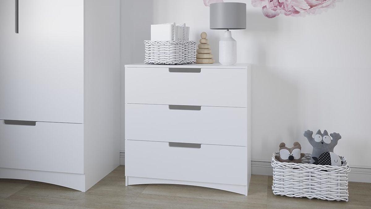 Bílá prostorná komoda do dětského pokoje zaujme svou jednoduchostí se zajímavými prvky jako jsou otvory na prsty v šuplících a oblouk ve spodní a horní části .. več