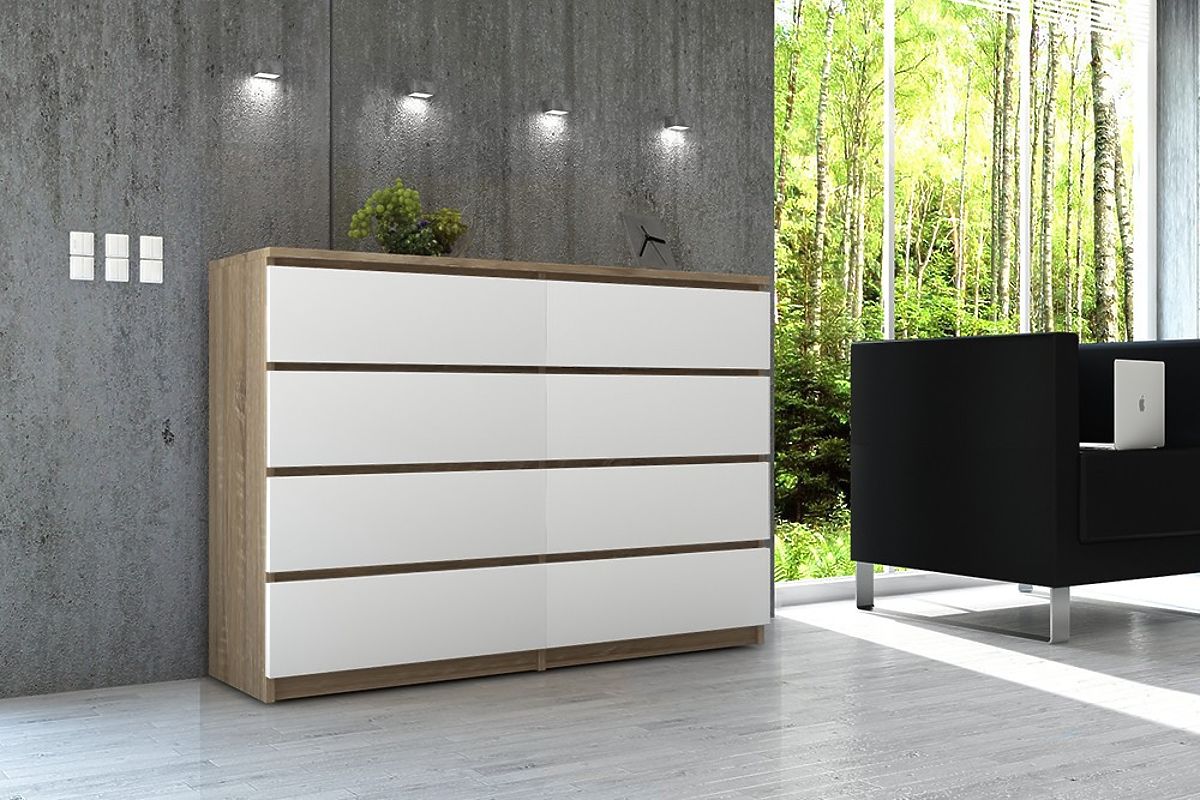 Lepa, moderno oblikovana komoda, ki se lahko uspešno uporablja v dnevni sobi, spalnici ali jedilnici, je visokokakovosten izdelek. Pohištvo je izdelano iz laminirane plošče debeline 16 milimetrov, ki je odporna proti obrabi, vzdržljiva in se lepo predstavlja v vsakem prostoru. Robovi komode so oblepljeni z ABS robom. Bela čela se popolnoma ujemajo s sodobnimi trendi, posebno pozornost pa si zasluži trdna konstrukcija pohištva, ki je opremljeno z osmimi prostornimi predali. Predali se premikajo na kovinskih krogličnih vodilih, celotno pohištvo pa je namenjeno samostojni montaži. To je ponudba za tiste, ki želijo slediti duhu časa, hkrati pa izbirajo pohištvo, ki je na voljo v brezčasni, univerzalni barvni shemi. Komodo je mogoče kombinirati z drugim pohištvom v istem slogu, ki je prav tako del naše ponudbe. Priporočamo, da se podrobneje seznanite z našim bogatim asortimanom, ki je na voljo po ugodni ceni.
