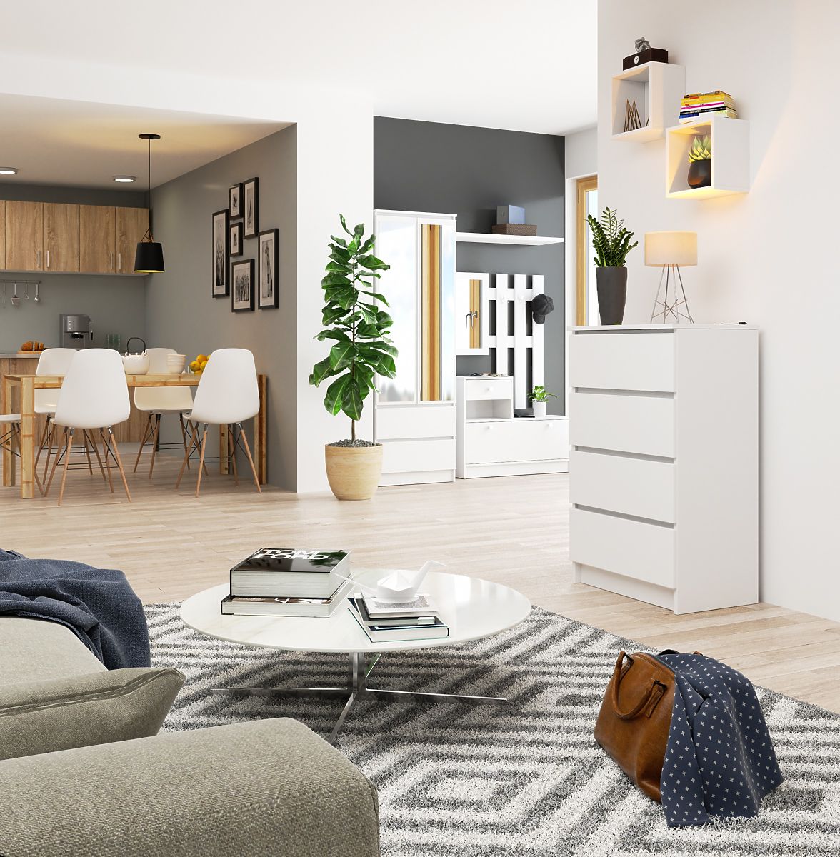 Visoka komoda v beli barvi je zanimiva izbira, ki jo je mogoče uporabiti tako v bivalnih kot v pisarniških prostorih. Funkcionalno pohištvo sestavljajo štirje predali iz laminirane plošče debeline 16 milimetrov. Material je zelo odporen proti obrabi, kar vpliva na trajnost in trdnost komode. Pozornost si zasluži njen sodoben dizajn - preprostost in eleganca ter minimalistični slog, v katerem je ohranjena. Poceni, a zelo učinkovita izbira bo zagotovo popolnoma izpolnila svojo funkcijo, saj omogoča shranjevanje številnih potrebnih predmetov v predsobi, jedilnici, dnevni sobi, mladinski sobi ali spalnici. Izdelek za samostojno montažo se odlikuje po izjemno skrbni in trdni izdelavi.