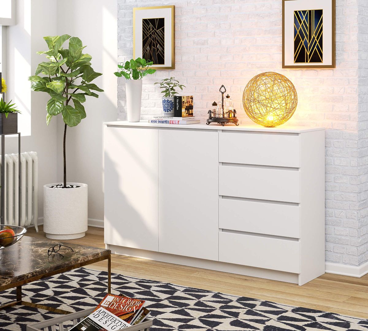 Bela komoda se prav tako odlikuje po visoki praktični vrednosti. Ima namreč 4 predale, ki se udobno odpirajo, in 2 zelo veliki polici. Takšna konstrukcija zagotavlja udobje pri shranjevanju in je zelo funkcionalna rešitev. V komodi lahko shranite vse potrebne stvari in jih imate vedno na enem mestu, na dosegu roke.