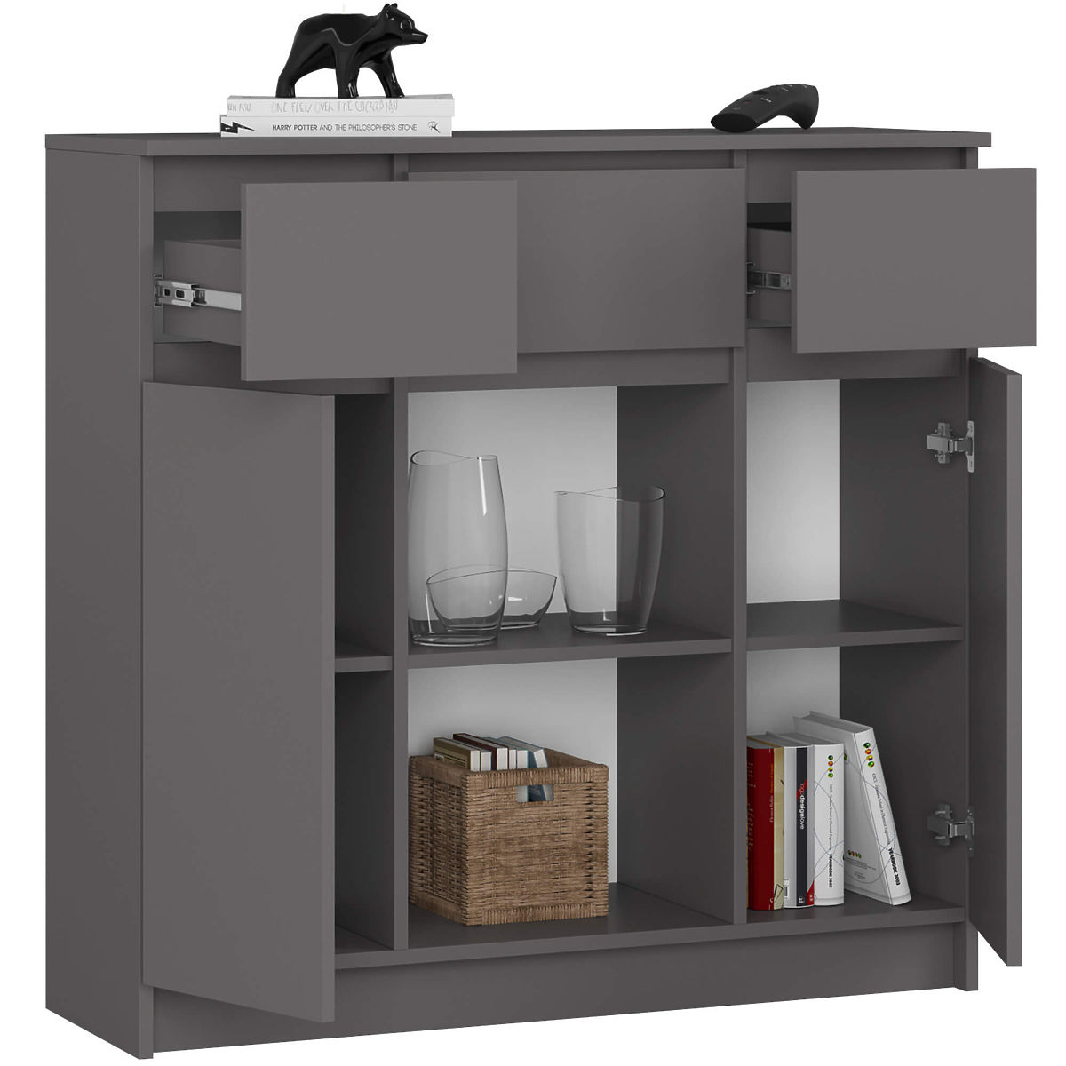 Komoda K100 z grafitno sivo barvo in 3 predali. .. več