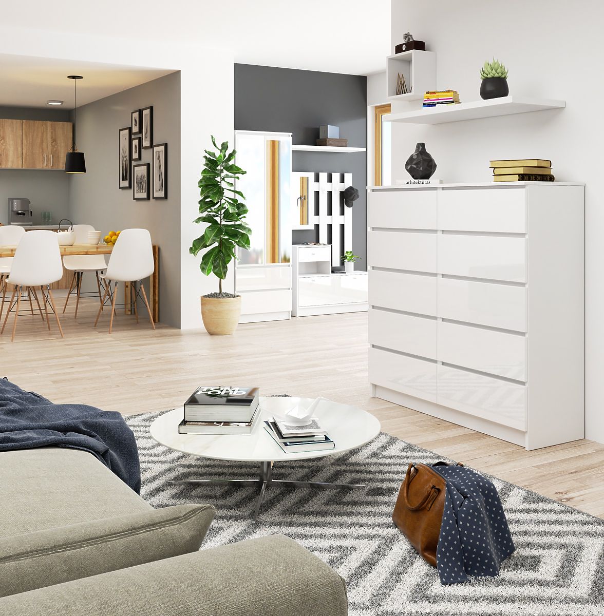 Komoda z 10 predali in belim visokim sijajem. .. več