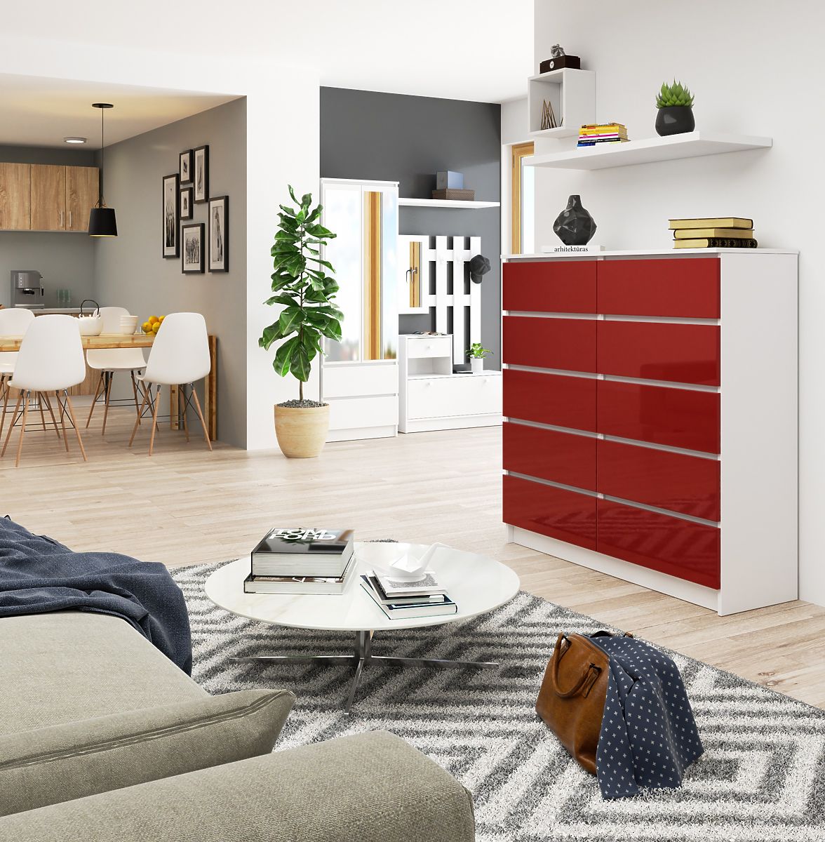 Komoda bela / rdeči sijaj je pohištvo, ki dobro izgleda na ozadju bele, mornarsko modre, sive in cappuccino, a drznejši jo lahko kombinirajo z energično oranžno, steklenično zeleno ali globoko vijolično. Pohištvo se odlično prilega v dnevno sobo, krojaške in obrtne delavnice, v sodobne pisarne, urejene v drznem slogu s šarmom. Lahko jo uspešno vključite tudi v klasične aranžmaje.