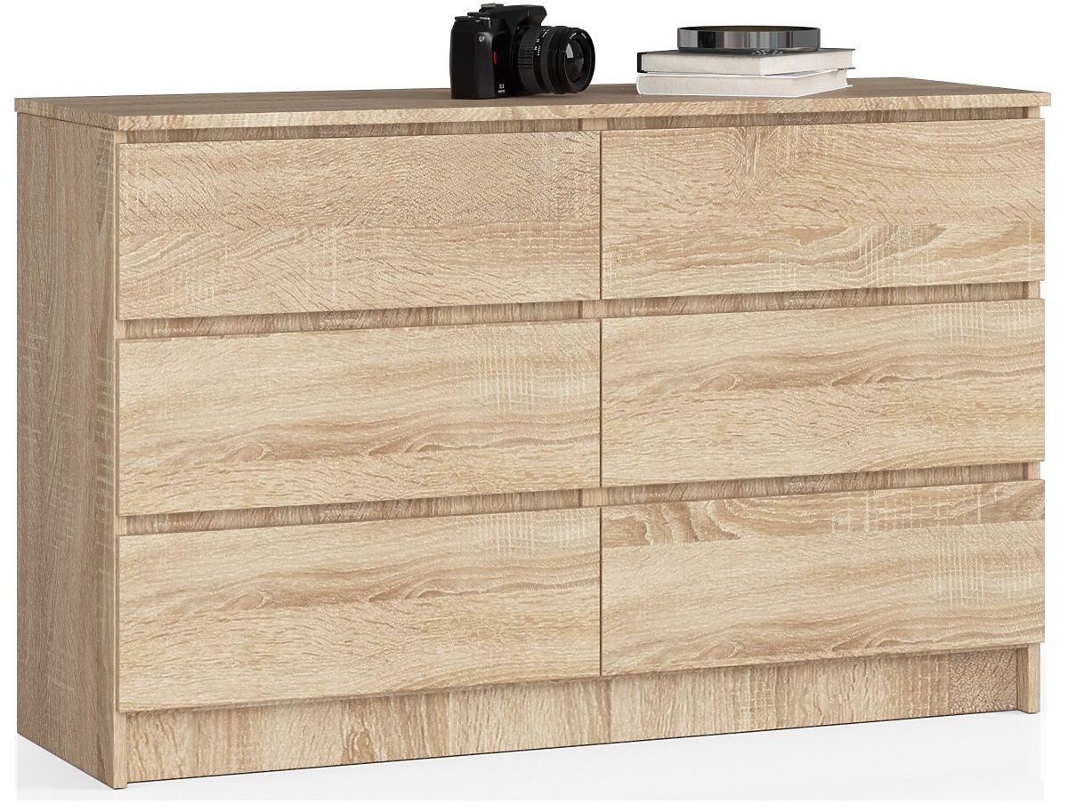 Če iščete izjemno prostoren, a eleganten kos pohištva, je komoda K120 iz naše ponudbe odlična rešitev! Izdelana iz visokokakovostne laminirane plošče in opremljena s kar 6 predali, je komoda idealna izbira za spalnico, dnevno sobo, predsobo ali pisarno. Svoj eleganten videz dolguje ne le okusni in funkcionalni konstrukciji, temveč tudi modni barvi hrast sonoma.