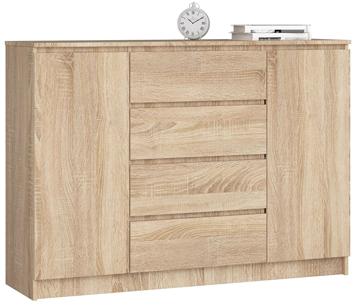Velika, prostorna in funkcionalna komoda je priljubljen kos pohištva, zlasti v prostorih, kot sta dnevna soba ali spalnica. Predstavljamo komodo K140 z dimenzijami 99 cm višine, 138 cm dolžine in 40 cm globine, ki je izdelana iz laminirane plošče debeline 16 mm proizvajalca Kronospan. Zaradi tega je odporna proti obrabi. Robovi so tudi ustrezno zaščiteni z ABS robovi. Pohištvo ima 4 predale, ki se gladko premikajo po kovinskih krogličnih vodilih, in dve omarici. Znotraj vsakega vratca je ena polica. Pohištvo je v barvi sonoma, ki je izjemno elegantna in stilna barva. Komoda ima preprosto obliko in univerzalen značaj, zato se odlično prilega prostorom z različnimi stili in aranžmaji. Je trpežna, prostorna in udobna za uporabo.