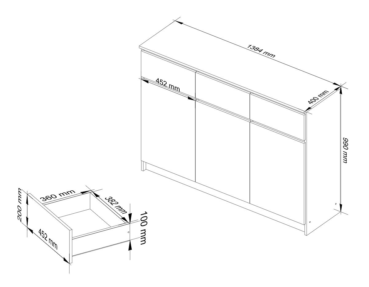 Predstavljamo izjemno elegantno komodo, izdelano iz visokokakovostne laminirane plošče. Debelina je 16 mm in je odporna proti obrabi. Izvira od priznanega proizvajalca Kronospan, kar zagotavlja njeno trajnost. Komoda ima tri predale in tri omarice. Predali se premikajo na kovinskih krogličnih vodilih, kar zagotavlja gladkost in lahkotnost pri odpiranju in zapiranju. Vsaka omarica ima prostorno polico, ki jo je mogoče odpreti z vrati. Robovi pohištva so oblepljeni z ABS robom, ki zagotavlja visoko zaščito pred poškodbami.