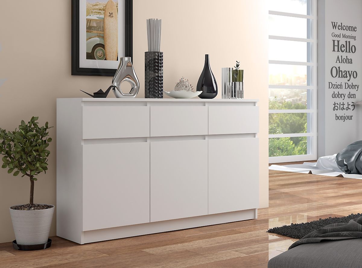 Komoda je namenjena samostojni montaži. Vsakemu naročilu je priložena navodila, ki preprosto in pregledno pojasnjujejo, kako sestaviti pohištvo. Čeprav se komoda ponaša z visoko odpornostjo in trajnostjo, nudimo garancijo za obdobje 24 mesecev. Ob naročilu ste lahko prepričani, da bo izdelek prispel v popolnem stanju. Naša komoda je preprosta v obliki, zaradi česar jo je mogoče enostavno prilagoditi različnim vrstam notranjih ureditev. Odlično se prilega tako v dnevno sobo kot na hodnik ali v spalnico. Je prostorna in funkcionalna. Na njeni plošči je mogoče postaviti različne dekorativne predmete, s čimer pohištvo pridobi značaj. Komoda je zasnovana v duhu brezčasne elegance, zato se ponaša z univerzalnostjo. Njena prednost je tudi skrbna obdelava in visoka odpornost proti poškodbam. Visoka je 99 cm in dolga 138 cm. Komoda tehta skupno 65 kg. Njena barva je plemenita bela.