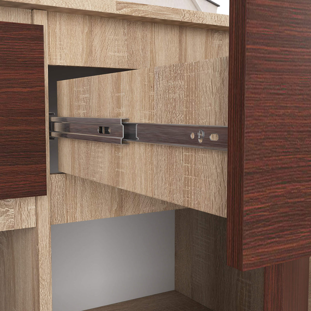 Velika, zelo prostorna in funkcionalna komoda, izdelana iz kakovostne laminirane plošče, odporne proti obrabi, se bo lepo predstavila v vsakem dnevnem prostoru, pa tudi v drugih bivalnih ali pisarniških prostorih. V pohištvu je uporabljena odporna plošča znamke Kronospan debeline 16 milimetrov. Predali se premikajo na kovinskih vodilih, zato je pohištvo enostavno za uporabo v vsakdanjem življenju. Robovi pohištva so oblepljeni z ABS robovi, ki zagotavljajo zaščito pred poškodbami. Izdelek je namenjen samostojni montaži. Univerzalne barve wenge in sonoma se odlično kombinirajo in tvorijo brezčasen celostni videz. Če od idealne komode pričakujete visoko kakovost, privlačen dizajn in sprejemljivo ceno, je ta ponudba namenjena prav vam.