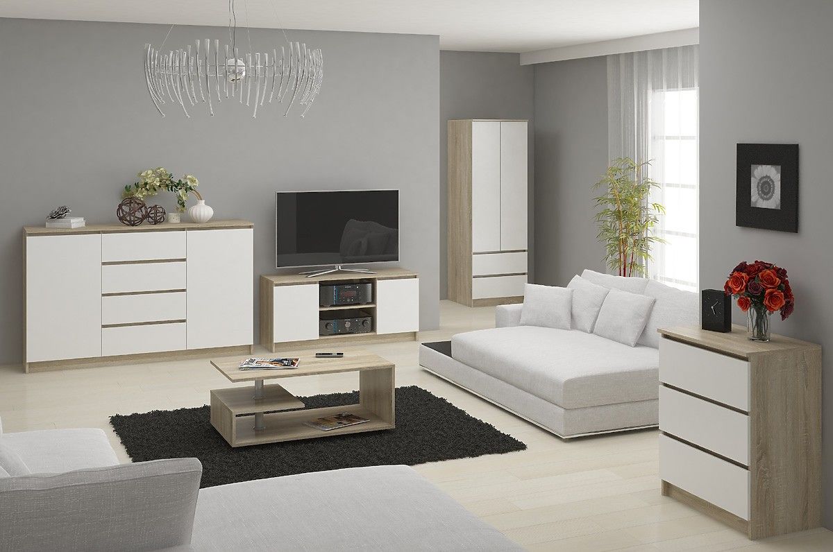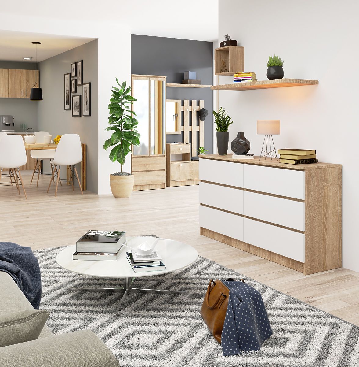 Velika komoda s šestimi predali je zanimiva ponudba, ustvarjena na podlagi potreb in pričakovanj strank, ki sledijo najnovejšim trendom v aranžmaju, ki dajejo prednost svetlemu, enostavno vzdržljivemu in predvsem funkcionalnemu pohištvu. Komoda K140 je kombinacija dveh zelo modnih barv - bele in hrasta sonoma. Pohištvo se lahko uspešno uporablja v dnevni sobi, kot tudi v mladinski ali gostinski sobi. Prav tako se prilega spalnici, jedilnici ali pisarni.