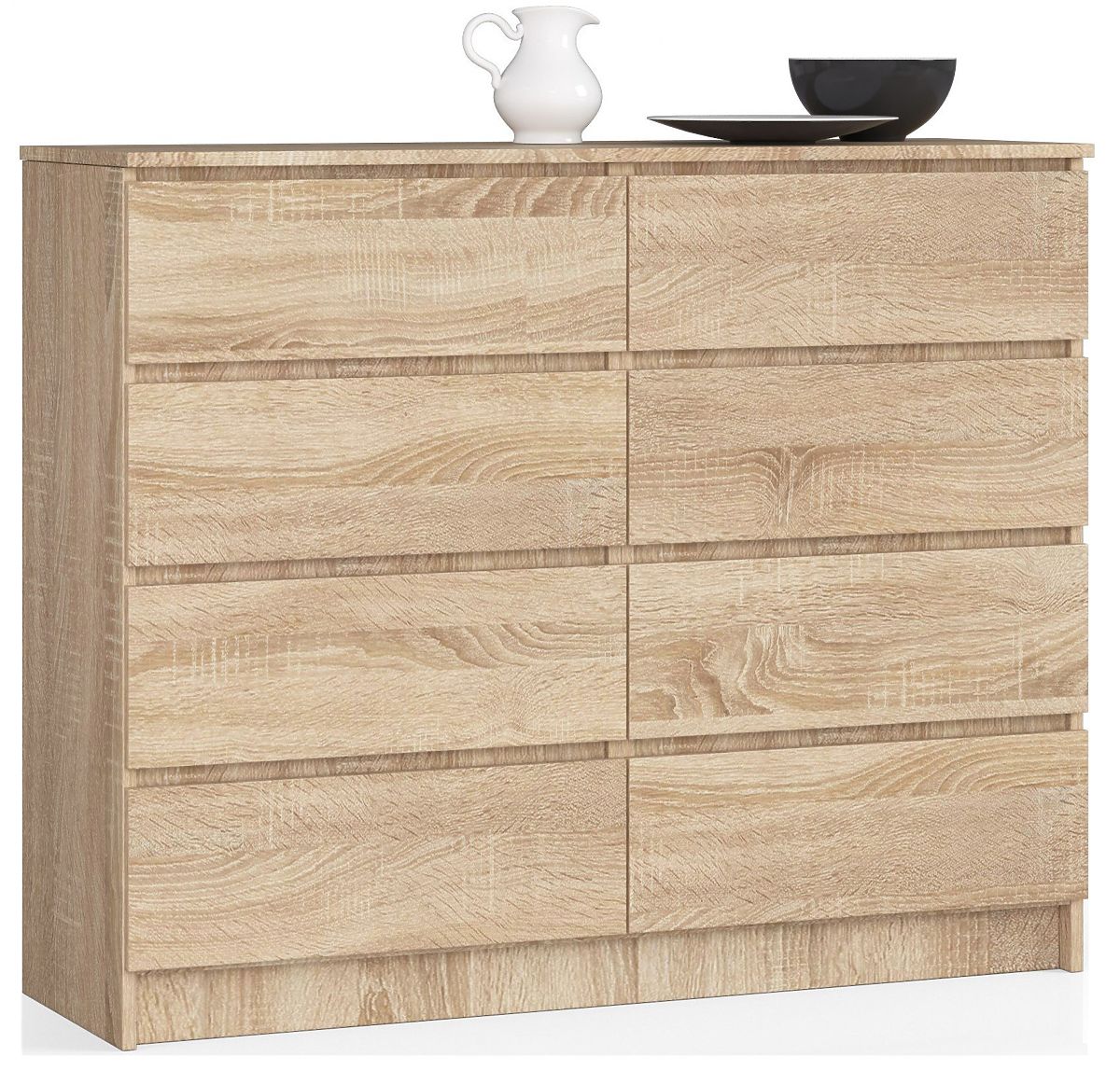 Predstavljeno pohištvo se bo zagotovo odlično obneslo v dnevni sobi, pa tudi v spalnici, jedilnici ali domači pisarni. Komoda K140, opremljena z osmimi predali, se bo izkazala tudi kot praktična rešitev v vsakem pisarniškem prostoru. Značilnosti te ponudbe so predvsem modna barva hrast sonoma, funkcionalnost in trdna izdelava. Pohištvo, izdelano iz laminirane plošče debeline 16 milimetrov, ki je odporna proti obrabi, bo zagotovo navdušilo tiste, ki imajo radi praktično urejene, moderne prostore. Velika komoda po konkurenčni ceni bi morala izpolniti zahteve vseh strank, ki cenijo dober odnos med nizko ceno in visoko kakovostjo izbranih izdelkov. Pohištvo je enostavno za čiščenje in se odlično kombinira s katerimikoli dodatki.