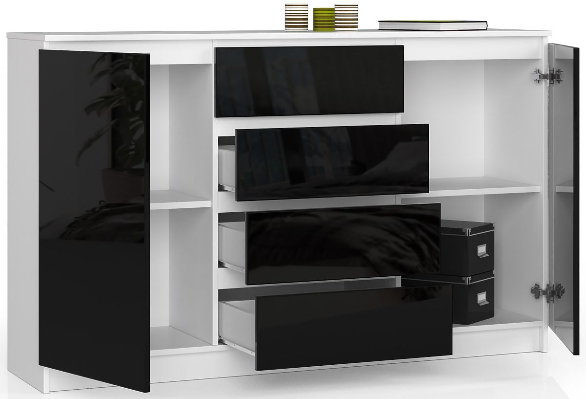 Komoda K 160 cm je pohištvo z izjemnimi vizualnimi lastnostmi. Univerzalna črna barva front, zaključena s sijajem, se popolnoma ujema s polmat korpusom. Monokromatska barvna shema se odlično prilega notranjosti, urejeni v sodobnem, minimalističnem slogu, kot so dnevna soba, spalnica ali mladinska soba.