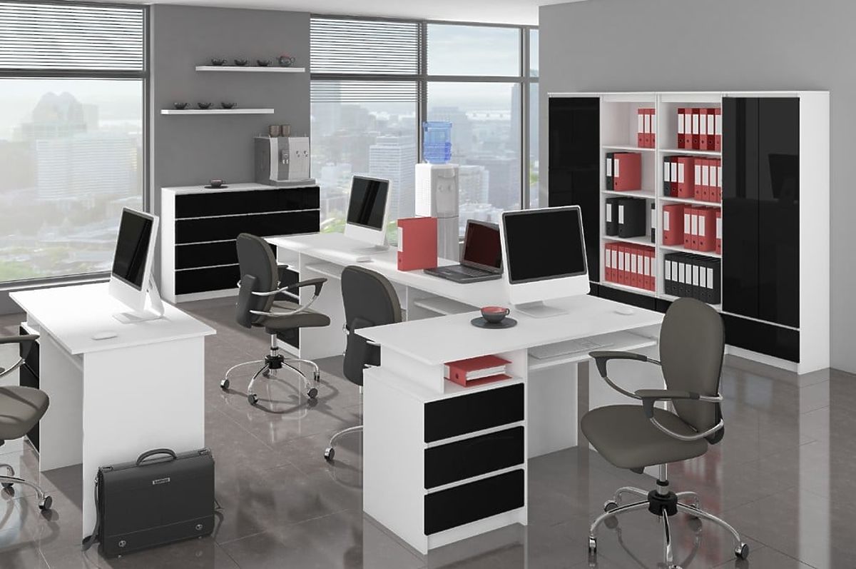 Korpus komode je izdelan iz 16 mm laminirane plošče v beli polmat barvi, fronte so iz 19 mm akrilne plošče v dekorju Črni visok sijaj.