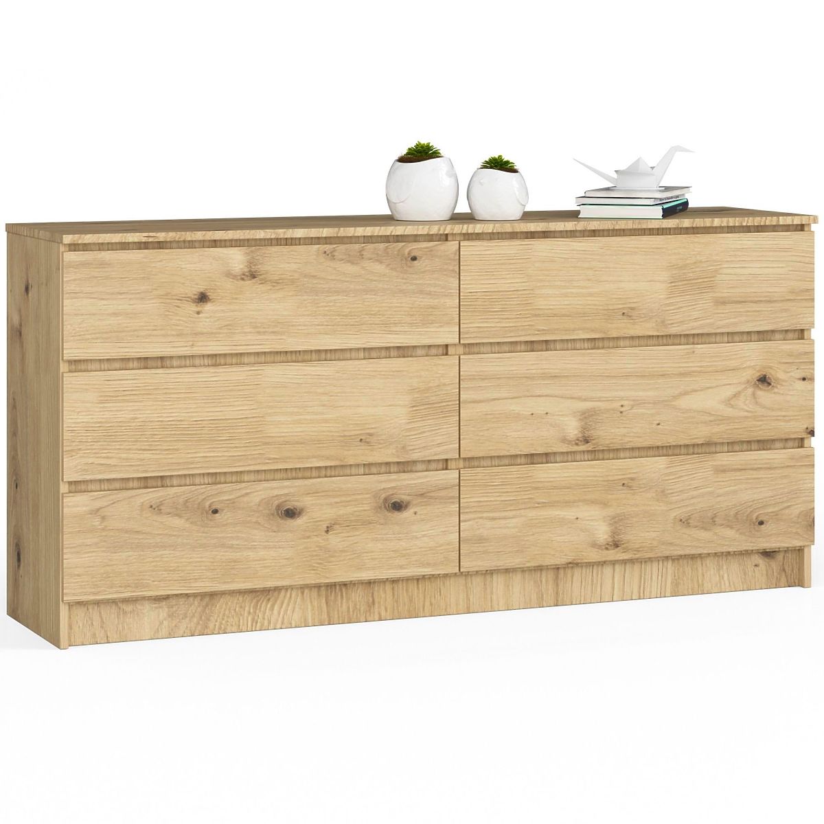 Moderna komoda K 160 cm je izdelek, ki združuje visoko estetiko izdelave in funkcionalnost. Pohištvo sestavlja šest prostorninskih predalov, zaradi česar je uporabno v dnevni sobi, otroški sobi, pisarni, jedilnici ter v mnogih drugih prostorih, kjer omogoča shranjevanje številnih predmetov. Komoda v zanimivi barvi (hrast artisan) se odlično prilega notranjosti, zasnovani v industrijskem, modernem, skandinavskem ali loft stilu, privlači pa tudi ljubitelje retro atmosfere. Je zanimiva ponudba, ki jo je mogoče dopolniti z drugimi komodami, omarami, regali in pisalnimi mizami, zasnovanimi v istem slogu. Minimalistična oblika v kombinaciji z visoko kakovostjo bo zagotovo pritegnila mnoge kupce.