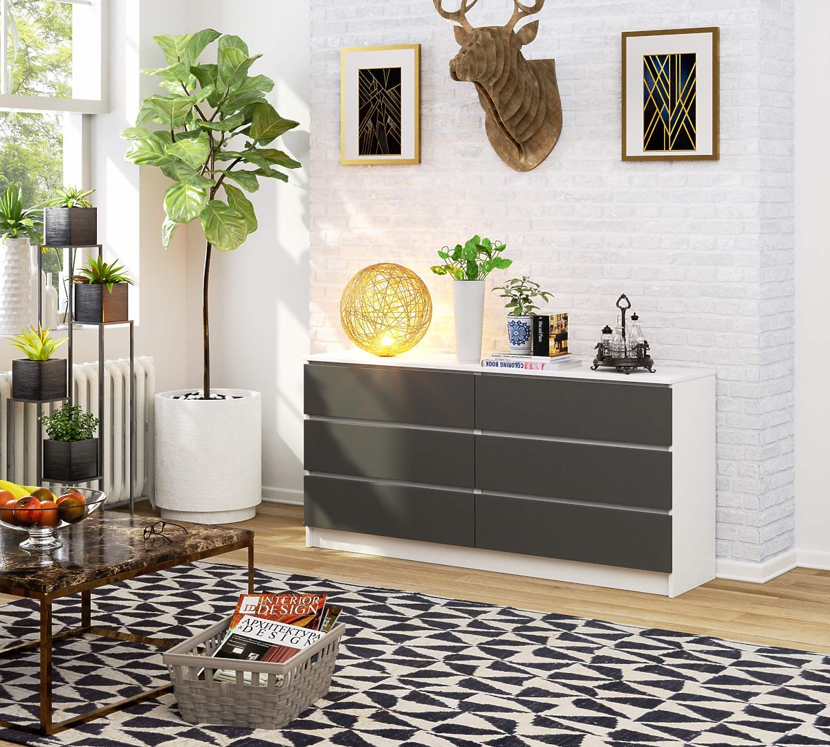 Komoda je kos pohištva, ki je tako vsestranski, da ga lahko uporabite v katerem koli prostoru. Najpogosteje se pojavlja v dnevnih sobah, otroških sobah, spalnicah, jedilnicah ali pisarnah. Komoda naj bi se vizualno ujemala z ostalim pohištvom v aranžmaju in hkrati izstopala s solidno in skrbno izdelavo ter funkcionalnostjo. Predstavljeni izdelek K 160 cm je sodoben model v brezčasni barvni kombinaciji. Kombinacija bele in grafitno sive bo brez dvoma pritegnila tiste, ki imajo raje minimalistični slog in interierje, urejene v skandinavskem slogu. Komoda je opremljena s šestimi prostornimi predali. Enostavno se odpirajo in zapirajo. Uporabna je tako v bivalnih kot pisarniških prostorih.