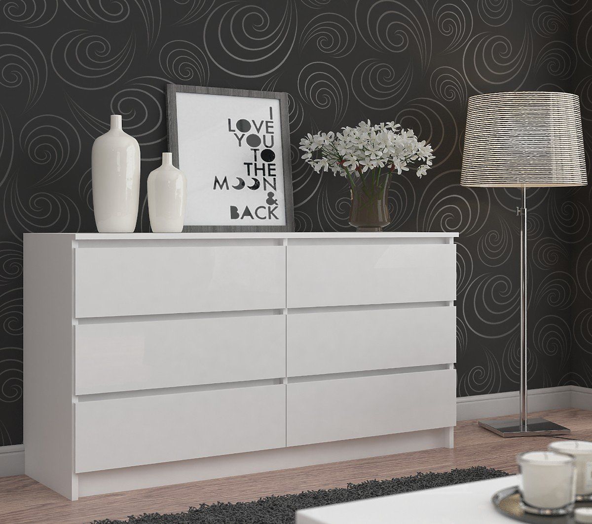 Klasično lepa komoda v beli barvi je ena izmed mnogih zanimivih ponudb naše spletne trgovine. Pohištvo sestavlja šest prostornin predalov. Vsak izmed njih zlahka sprejme vse potrebne predmete v danem prostoru. Komoda se bo odlično podala v dnevno sobo, pa tudi v otroško ali mladinsko sobo. Poleg tega se lahko uporablja v spalnici, gostinski sobi, jedilnici, predsobi in tudi v prostorih z nebivalnim značajem - na primer v hotelih ali pisarnah.
