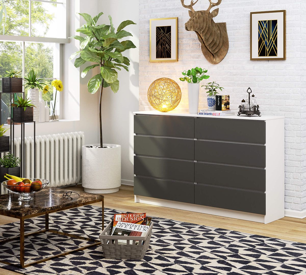 Komoda z osmimi predali iz bele in sive laminirane plošče. .. več