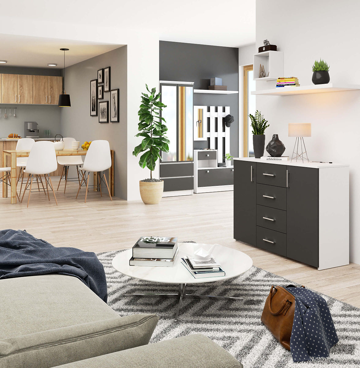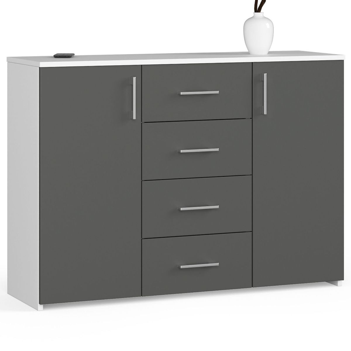 Komoda bela / grafitno siva je velik in prostoren kos pohištva z mnogimi uporabnimi funkcijami. Na obeh straneh komode so vrata, za katerimi so 4 globoke police. Sredina pohištva je prav tako zelo funkcionalno zasnovana, saj je opremljena s 4 globokimi predali. Komoda torej ponuja veliko prostora za shranjevanje.