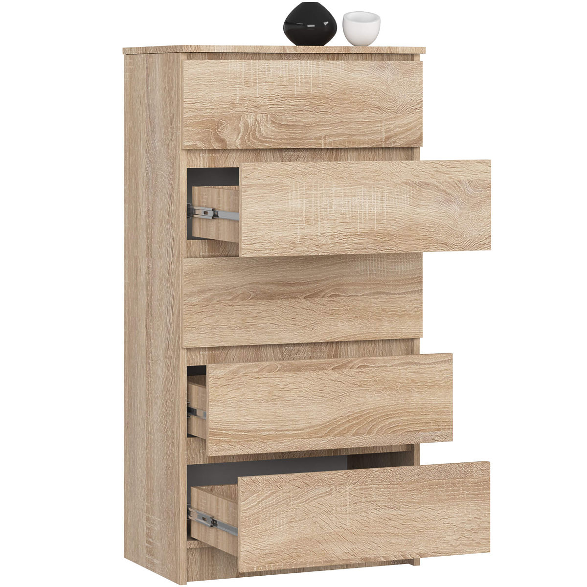 Exemplar v čudoviti barvi sonoma ima pet prostorskih predalov, ki delujejo na trpežnih krogličnih vodilih. Predali se zelo gladko izvlečejo in vstavijo. Komoda ima natančno 60 centimetrov dolžine, višina modela je 121 centimetrov, medtem ko globina znaša 40 centimetrov. Laminirana plošča, uporabljena pri izdelavi, ima debelino 16 milimetrov, ABS robovi povečujejo trpežnost in podaljšujejo življenjsko dobo pohištva. Skupna teža komode, ki je na voljo v naši ponudbi, je natančno 36 kilogramov.