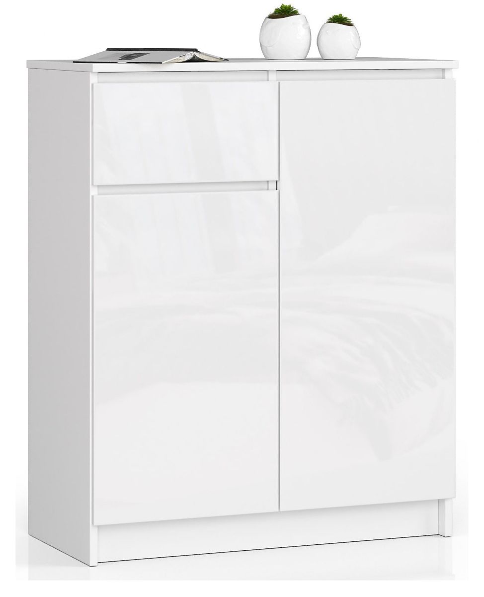 Majhna bela komoda je opremljena s praktičnim predalom in dvema zaprtima omarama - v vsaki sta dve polici. Pohištvo se odlikuje po trdni konstrukciji in skrbni izdelavi. Predstavljena ponudba bo navdušila oko in izpolnila pričakovanja tudi najzahtevnejših kupcev glede funkcionalnosti. Komoda K 80 cm je kombinacija belega korpusa z visokosijajnimi čelnimi površinami v isti barvi. Okusno pohištvo se bo nedvomno odlično podalo v številne interierje, urejene v skandinavskem, minimalističnem ali modernem slogu.