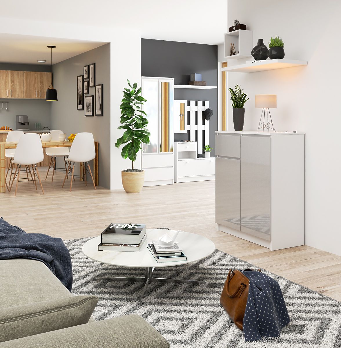 Komoda K 80 z dvema omaricama in predalom je izdelana iz trpežne pohištvene plošče Kronospan. Korpus pohištva je bel, medtem ko so čela omaric in sprednja plošča predala v kovinski barvi z visokim sijajem. Komoda je simetrično zasnovana. Njeno desno stran sestavljajo vrata, ki se odpirajo navzven, levo pa samostojen predal, nameščen tik pod ploščo in izvlečen s pomočjo kovinskih krogličnih vodil. Pod predalom se nahajajo druga vrata, ki se odpirajo enako kot desna - navzven. Notranjost komode je opremljena s 4 policami različnih višin.