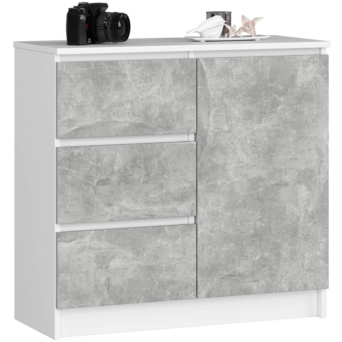 Majhna komoda je kos pohištva, ki bo našel prostor v vsakem prostoru. Sodobne barve, trdna konstrukcija in natančna izdelava so privedli do omarice, ki se bo izkazala na primer v predsobi, dnevni sobi ali mladinski sobi, pa tudi v spalnici. Uporabna je lahko tudi v pisarniškem prostoru, kjer omogoča shranjevanje številnih dokumentov in drugih pisarniških potrebščin. Komoda je sestavljena iz enih vrat (z dvema policama znotraj) in 3 predalov. Pohištvo združuje barvi belo in beton.