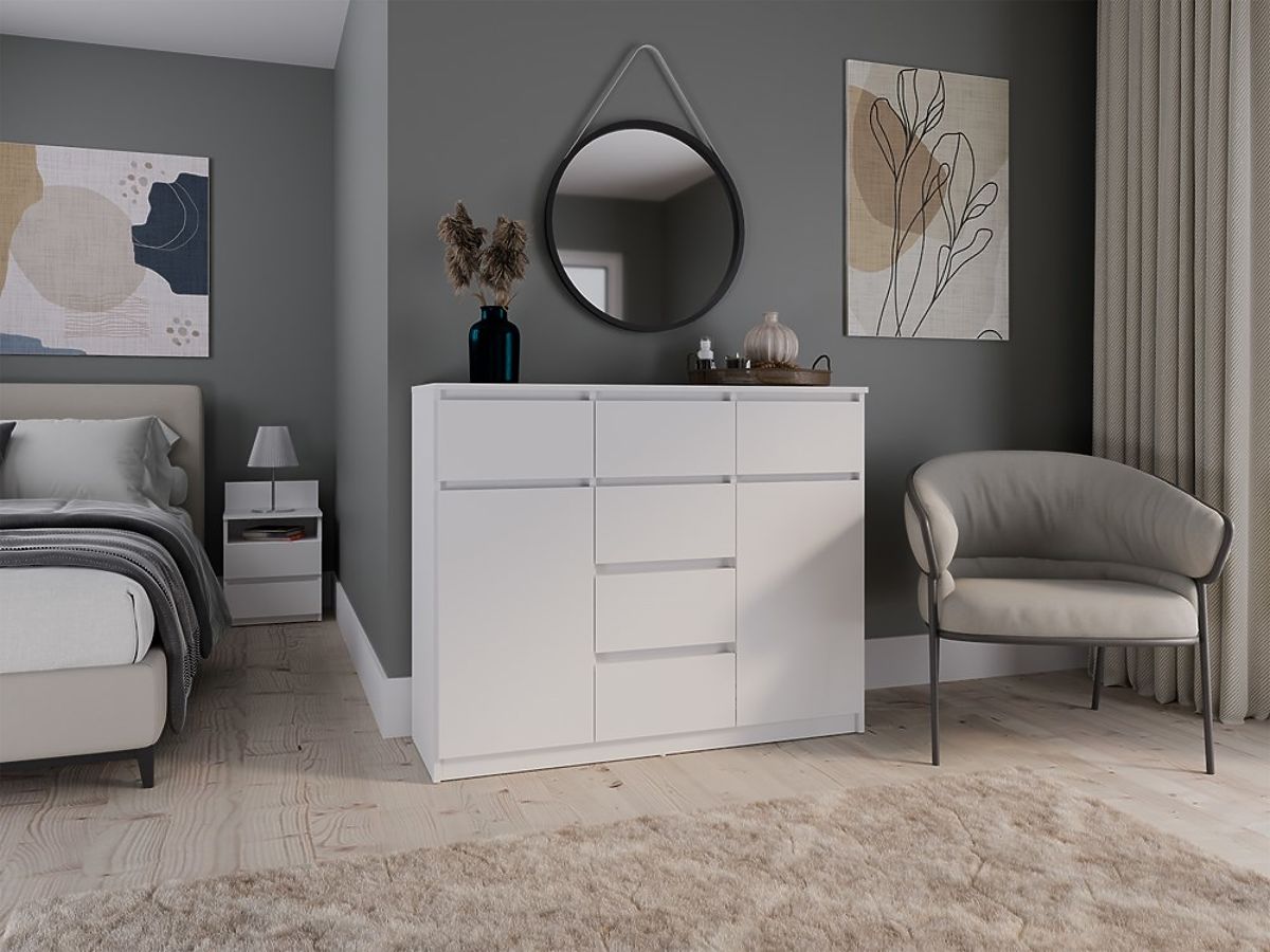 Prostornost in funkcionalnost: Komoda je opremljena z 2 vrati in 6 prostornimi predali, ki pomagajo pri organizaciji vašega prostora. Idealna za spalnico, dnevno sobo, otroško sobo ali predsobo – povsod tam, kjer potrebujete dodaten prostor za shranjevanje.