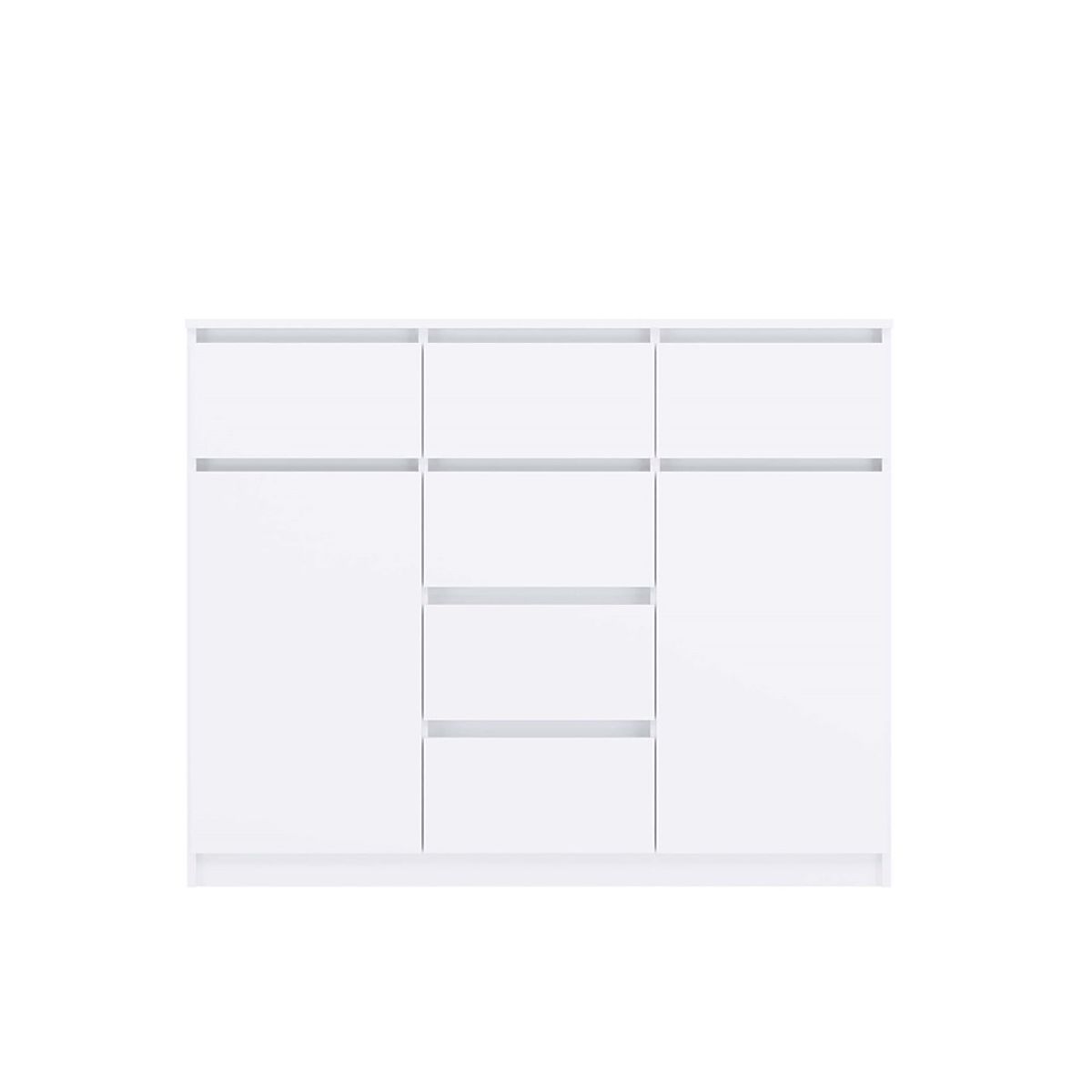 Univerzalen dizajn: Preprosta, elegantna oblika komode v mat beli barvi zagotavlja, da se prilega tako modernim kot klasičnim interierjem. Brezročajna sprednja površina poudarja minimalističen značaj in hkrati zagotavlja udobno uporabo.