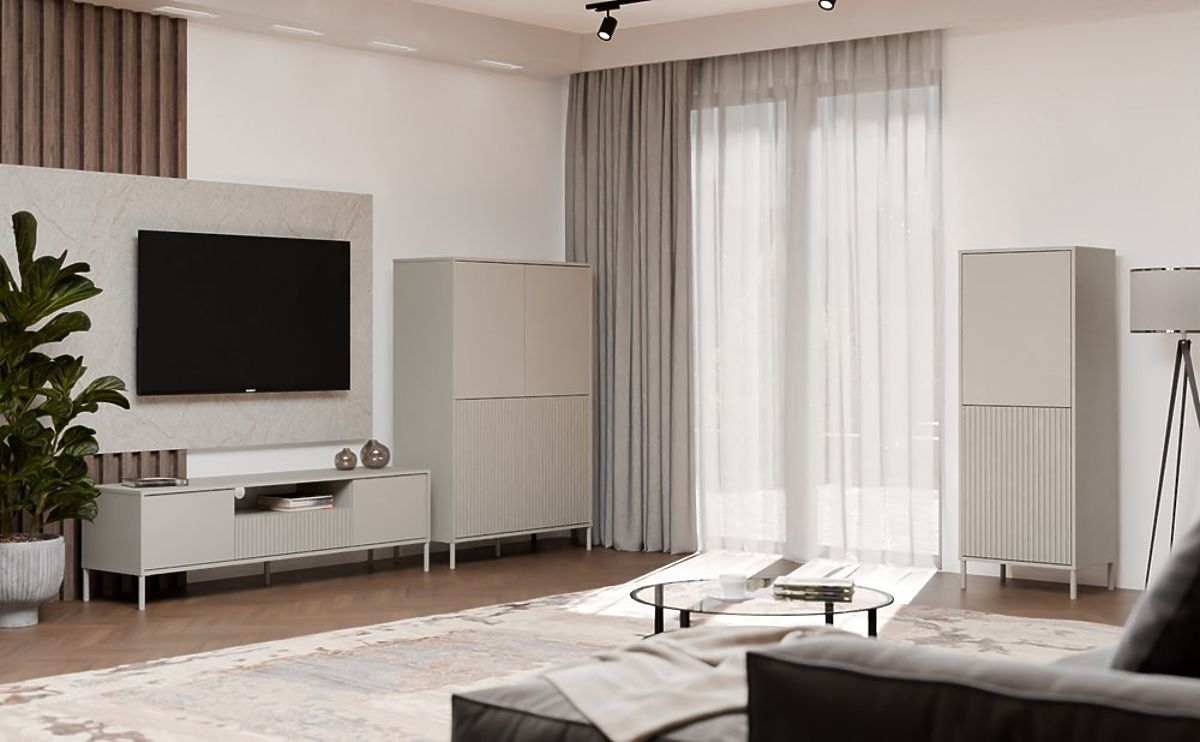ELEGANCA IN PRAKTIČNOST V ENEMVitrina KAMARO 2DK SLIM/GLADKI KAŠMIR je kombinacija estetike in funkcionalnosti, ki se popolnoma prilega dnevni sobi, gostinski sobi, spalnici ali delovni sobi. Kombinacija vrat z gladko čelno ploščo in vrat z žlebljeno čelno ploščo, ki spominja na lamele, dodaja značaj, sistem TIP-ON pa omogoča udobno uporabo brez ročajev. Pohištvo nudi dovolj prostora za shranjevanje in je hkrati stilski element v modernem interierju.