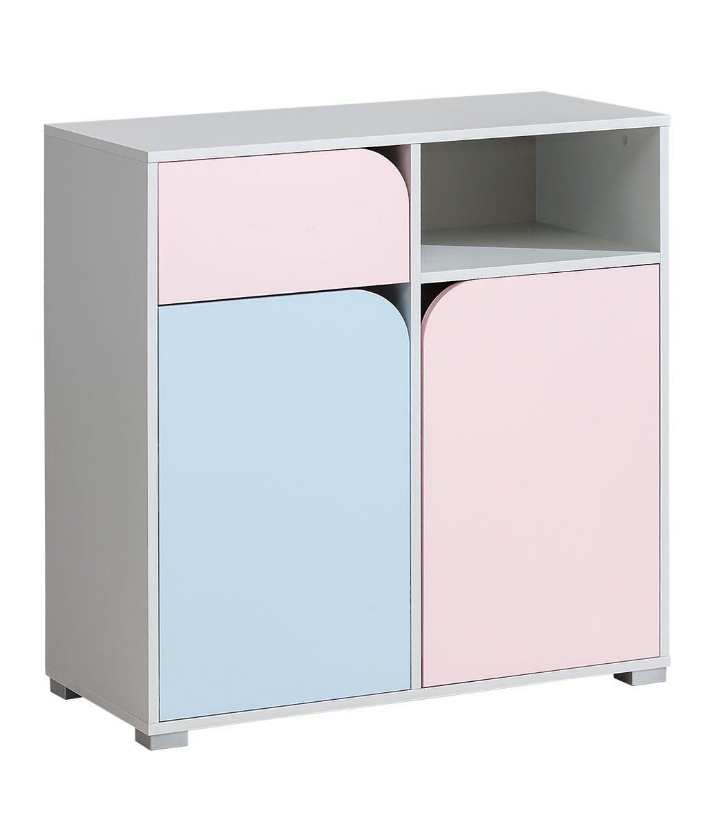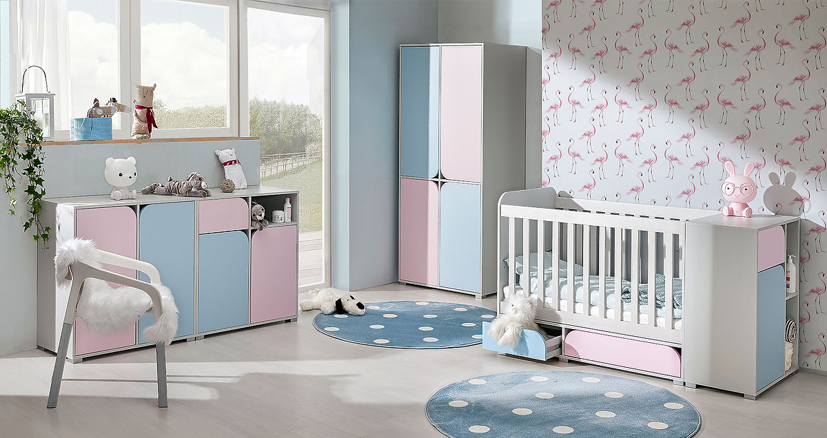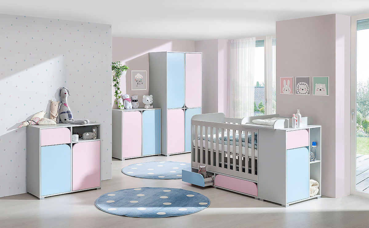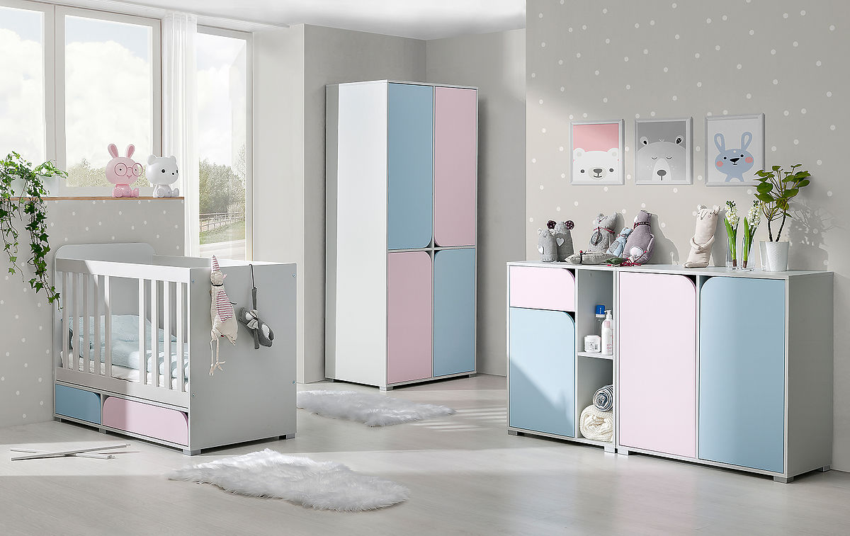 Prostorná kombinovaná komoda z kolekce nábytku pro miminko Mimo ve světlých barvách (šedá, modrá a růžová) zajistí, že dětský pokoj bude vždy uklizený a vše .. več