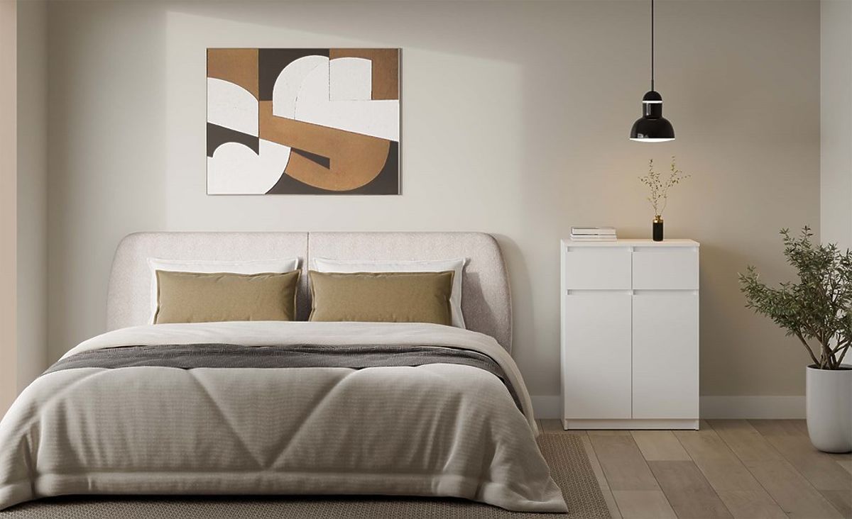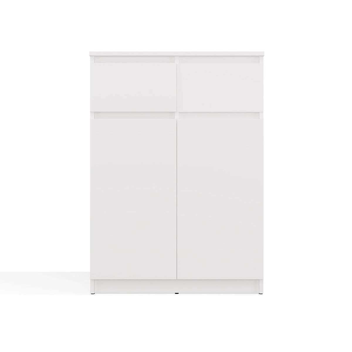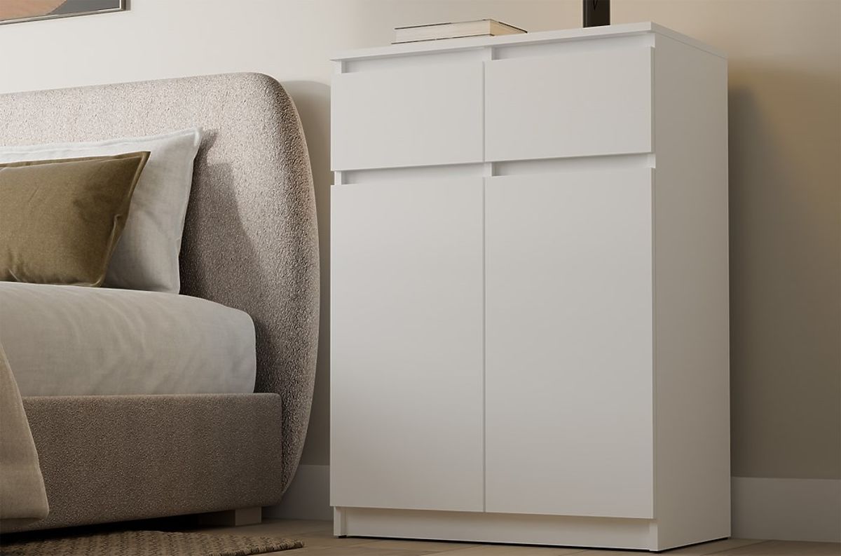 Komoda 2DD2S z dvema vratoma in predaloma v beli barvi. .. več