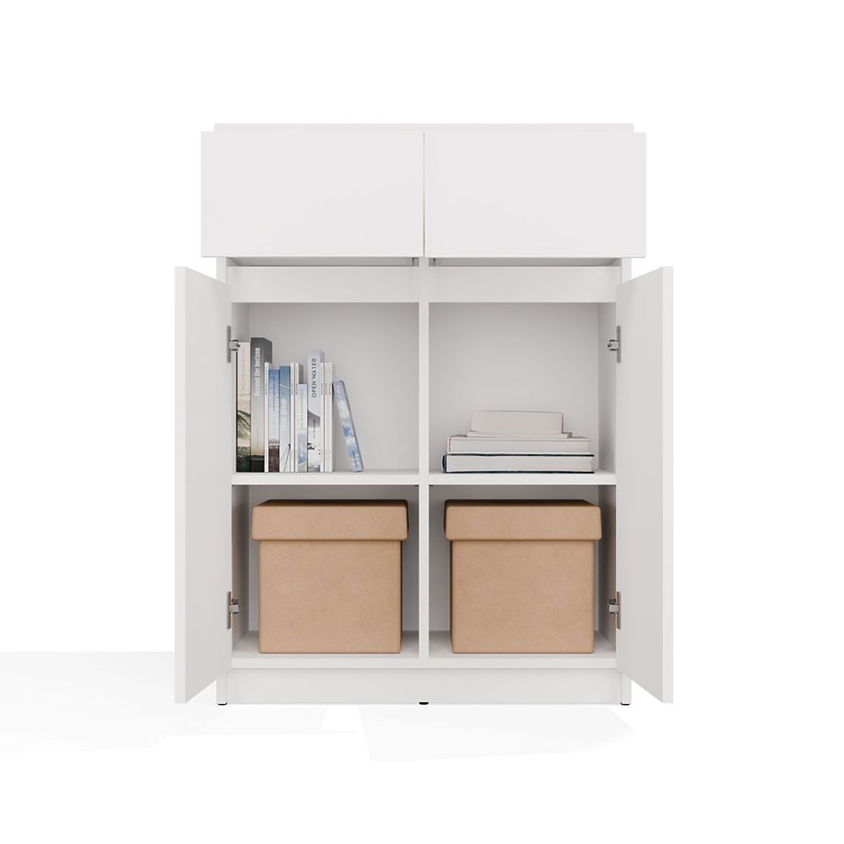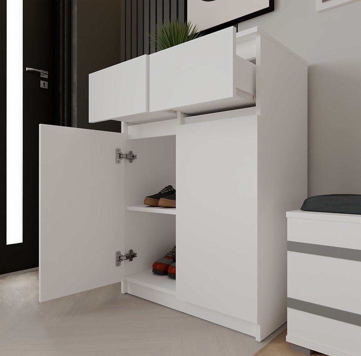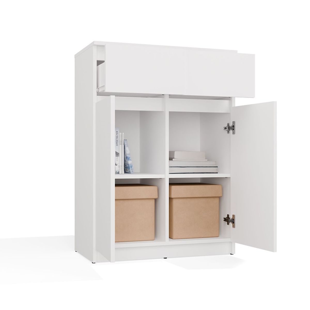 Komoda 2DD2S z dvema vratoma in predaloma v beli barvi. .. več