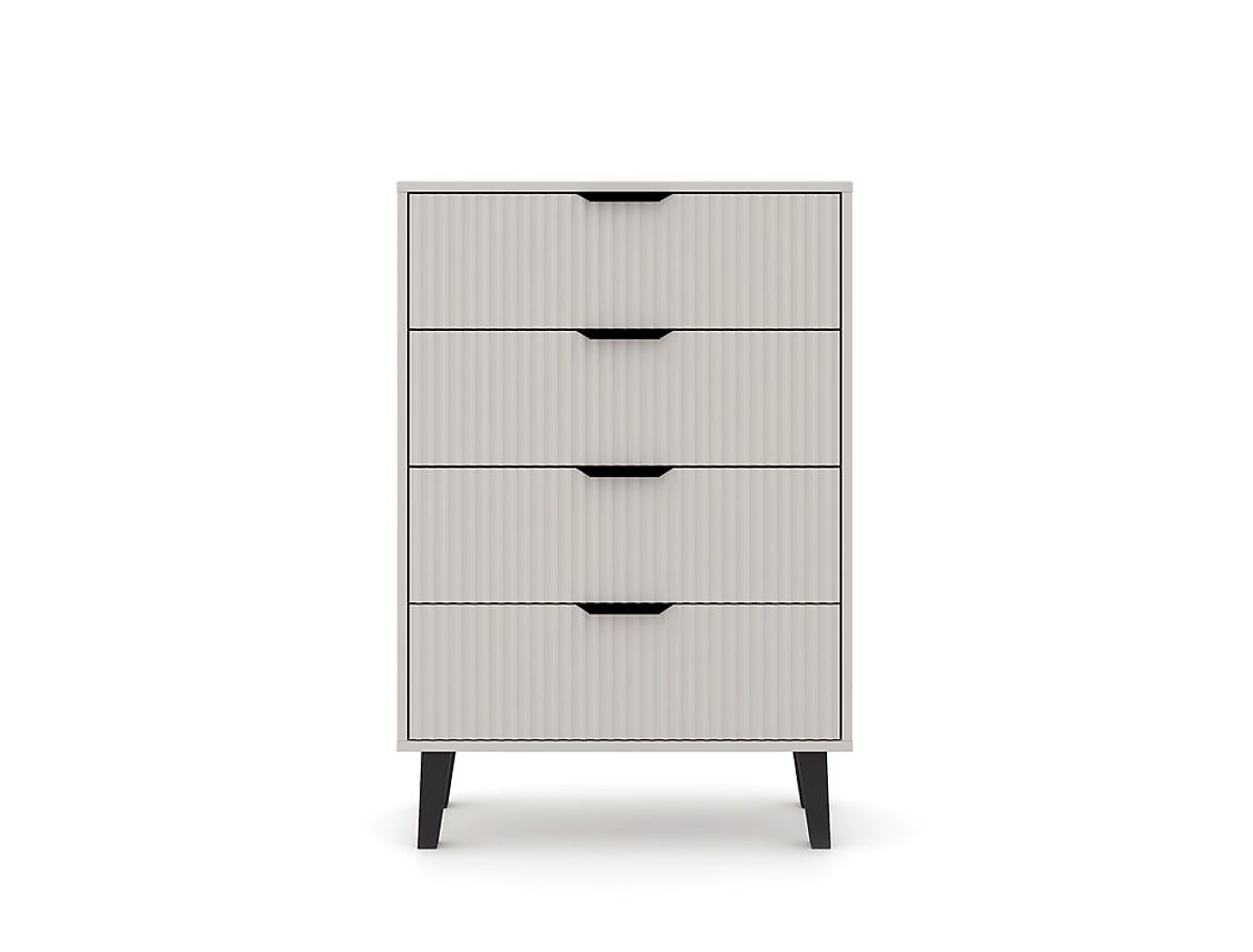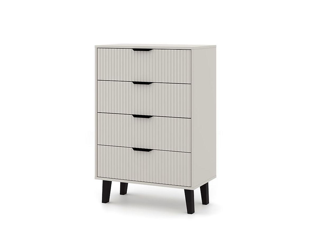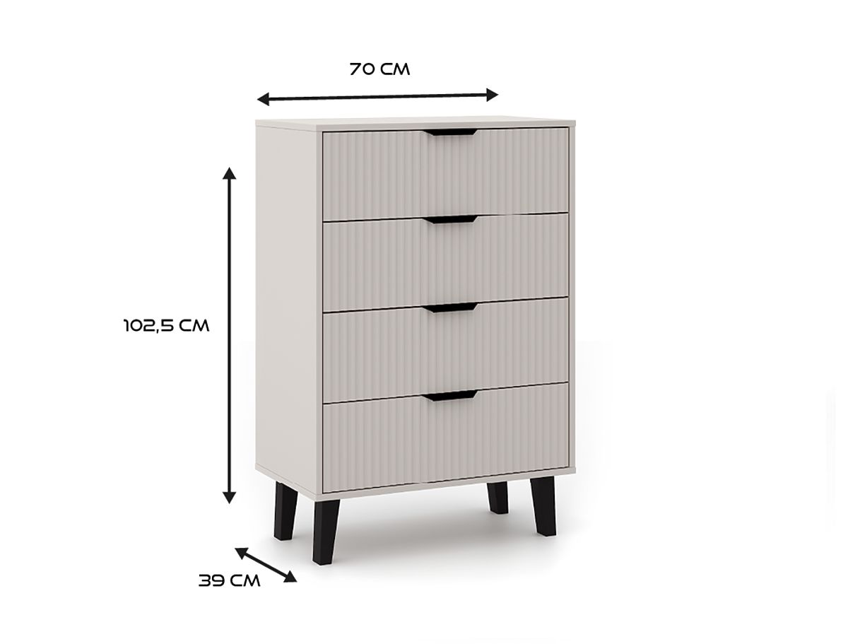 Komoda SCANDI 4S SLIM je odlična izbira za tiste, ki iščejo praktično shranjevalno pohištvo z dotikom modernega dizajna. Modna barva KAŠMIR v kombinaciji z utorjenimi čeli in visokimi črnimi nogami daje notranjosti prijetnost in hkrati eleganco.