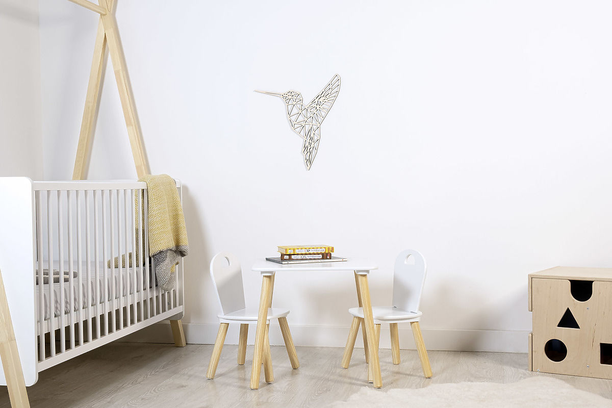 Lesena geometrijska figura v obliki kolibrija. Viseča dekoracija iz vezanega lesa je primerna za otroško sobo v skandinavskem slogu.