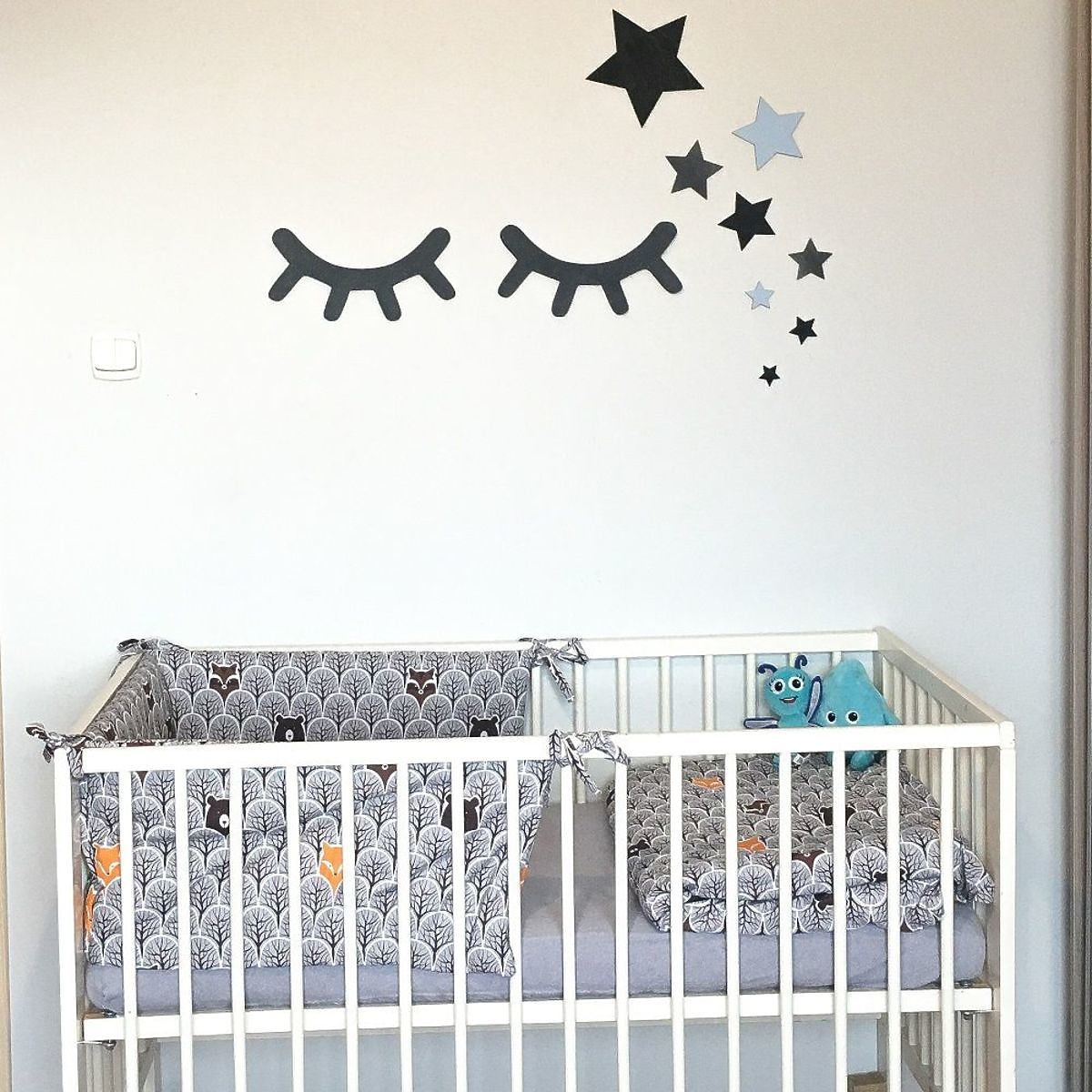 Polepšajte otroško sobo z elegantno stensko dekoracijo v obliki ljubkih spečih oči z zvezdicami različnih velikosti. Ta modro-črni komplet je narejen iz vezanega lesa .