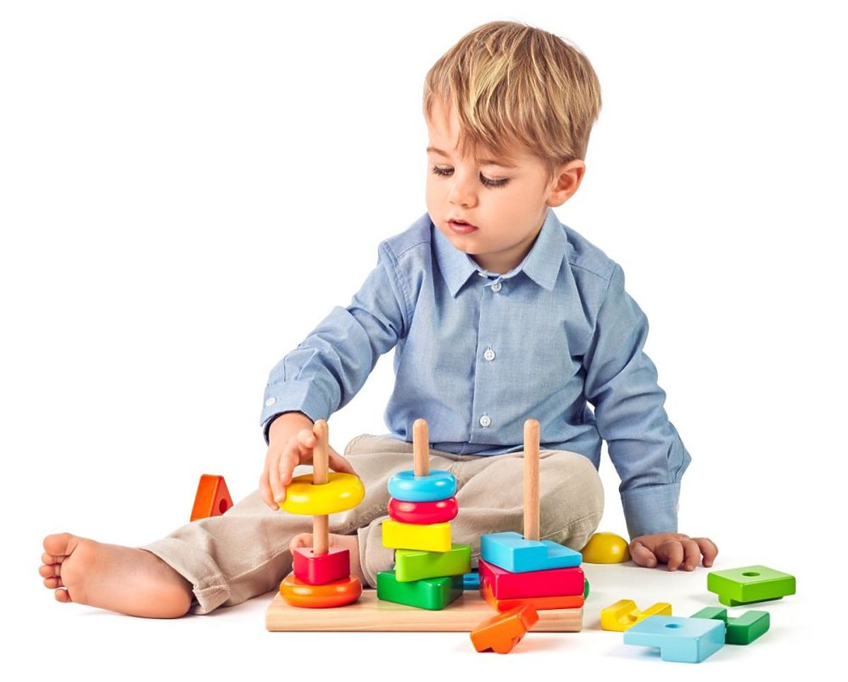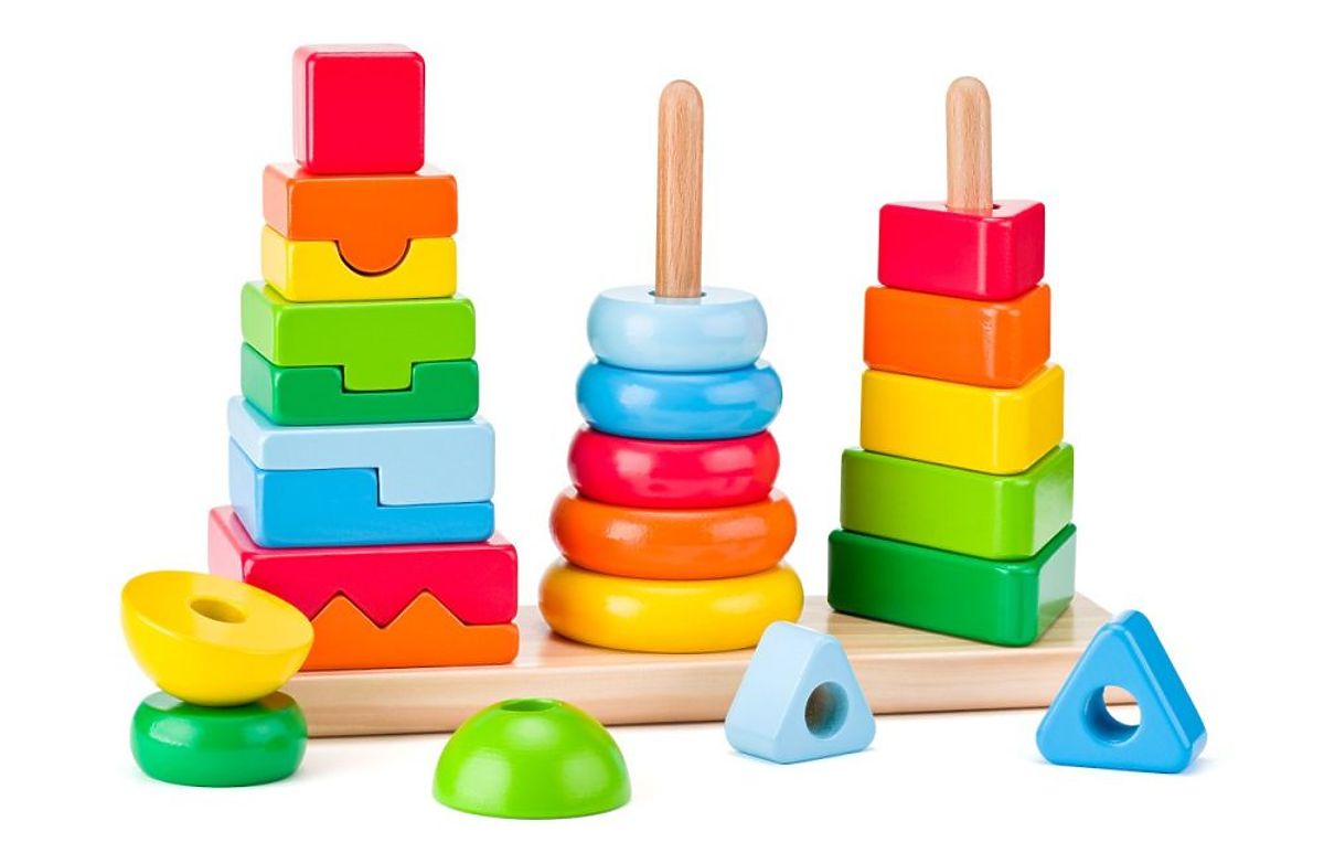 Na leseni osnovi so nameščeni trije količki. Naloga otroka je sestaviti stolp na vsakem izmed njih. Sortirna igrača bo vašemu otroku pomagala razviti ročne spretnosti, zlasti fino motoriko. Otrok bo izboljšal svojo sposobnost ohranjanja koncentracije ter spretnosti razlikovanja barv in oblik.