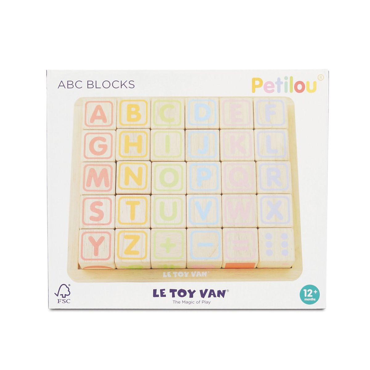 Naučite najmlajše abecedo na zabaven način! Kocke so tradicionalna otipna igrača, ki razvija spretnost, koordinacijo roka-oko, motoriko in prostorsko predstavo. Vsaka izmed 30 kock je ročno potiskana s sitotiskom, vsaka je edinstvena. Kocke imajo na vsaki strani drugačen dizajn – številke, črke, oblike, živali... Igrača je izdelana iz trpežnega kavčukovega lesa in pobarvana z vodnimi barvami, ki se ne luščijo. Kocke in osnovna plošča imajo zaobljene robove, ta igrača brez plastike je tako varna za otroke. Igrače s smislomVse igrače podjetja Le Toy Van so izdelane z namenom – da trajajo dolgo. Oblikovane z ljubeznijo izkušenih obrtnikov z uporabo etičnih praks in trajnostnih materialov, ki so prijaznejši do našega planeta. Glavne značilnosti: izdelano etično iz trajnostnega lesa testirano po najstrožjih standardih pobarvano z netoksičnimi vodnimi barvami spodbuja domišljijsko igro razvija kognitivne sposobnosti igrača brez plastike Nagrade igrače:Loved By Parents Best Buy Platinum Award 2018Early Years Five Star Excelence 2018Good Toy Guide Recommended Kolekcija Petilou: Kolekcija za dojenčke in malčke od Le Toy Van vsebuje predvsem otipne igrače, ki najmlajšim služijo tudi kot učna sredstva. Kolekcija je navdihnjena z naravo okoli nas in je zasnovana tako, da razvija čute otrok s pomočjo različnih zvokov, tekstur, oblik in teže. Otroci tako od malih nog vključujejo vse svoje čute. V kolekciji najdete na primer sestavljanke, vstavljanke, hojice, ... Znamka in certifikat FSC® (Forest Stewardship Council) zagotavlja, da les, iz katerega je bil izdelek izdelan, ni bil nezakonito posekan in izvira iz gozdov, ki so trajnostno ali naravi prijazno upravljani, kjer se upoštevajo stroge okoljske in socialne zahteve. Znamka FSC® na izdelku pomeni, da s svojim nakupom pomagate varovati gozdove in podpirate trajnostno, odgovorno ali naravi prijazno gospodarjenje, zaradi katerega so naši gozdovi stabilnejši, bolj zdravi, imajo naravno vrstno sestavo in se bolje upirajo negativnim posledicam podnebnih sprememb.