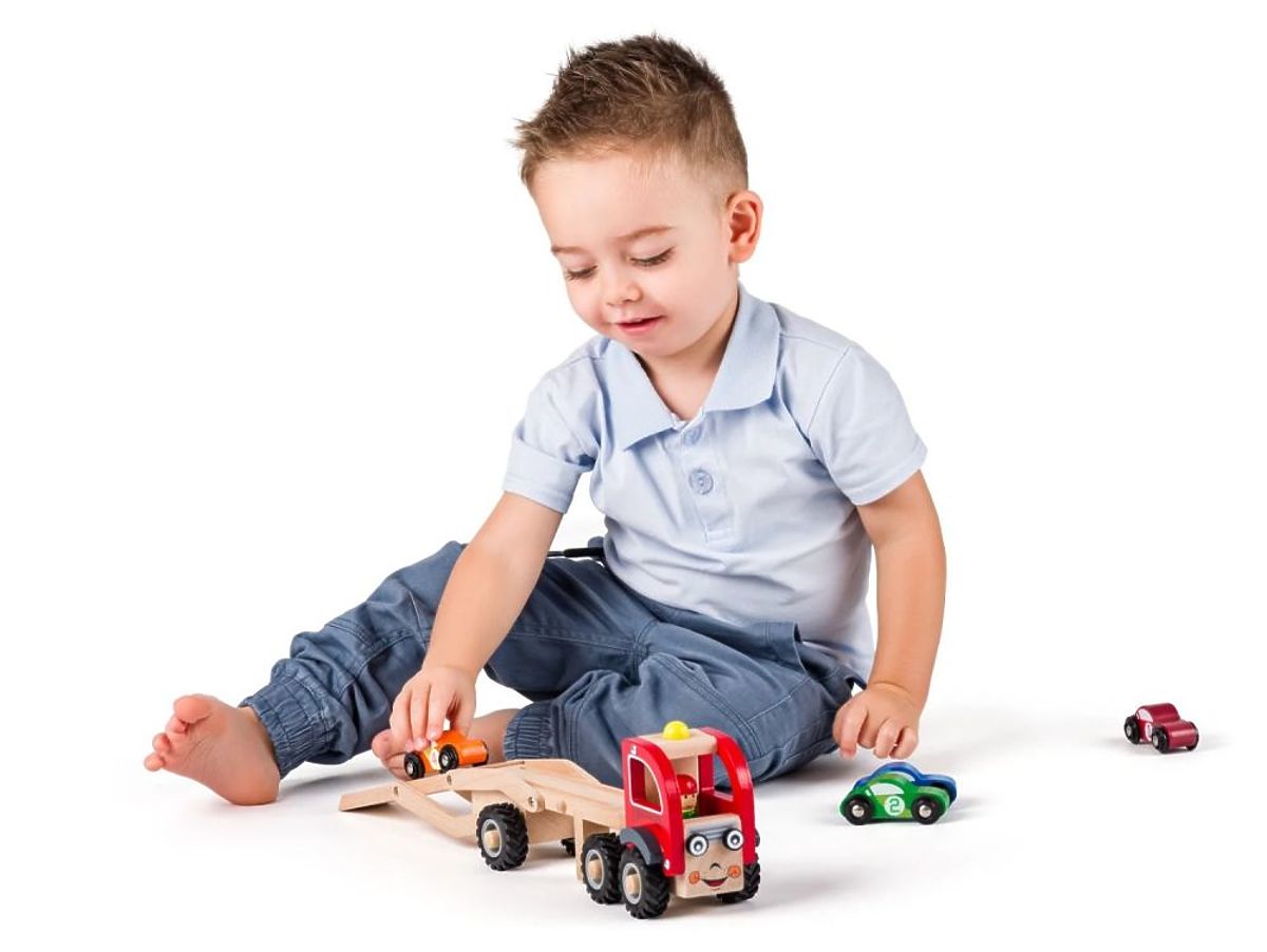 Izdelek je v celoti izdelan iz lesa (prevoznik ima gumijasta kolesa, majhni avtomobilčki pa plastična kolesa). Komplet je idealen za igro na preprogi ali tleh, prav tako pa se lepo prilega na otroško mizo.
