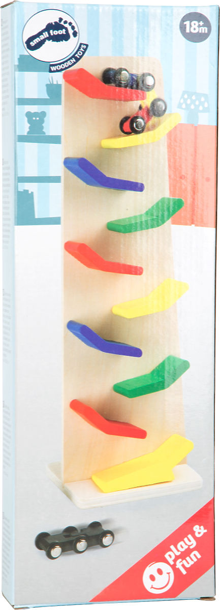 Majhni avtomobilski navdušenci bodo s tem lesenim kaskadnim stolpom resnično prišli na svoj račun, saj je tu zabava za njihove oči in ušesa. Ko se sprostijo majhna zgibna vozila, se spuščajo po rampah. Leseni dirkači drvijo po stezi, tako da otroci z vsakim spustom doživijo veliko zabave. Glavne lastnosti: razvija fino motoriko, robustna in trpežna lesena izvedba, igrača primerna tudi za vrtce