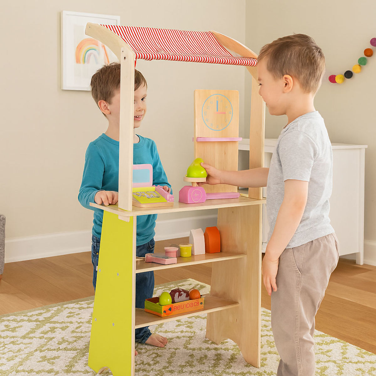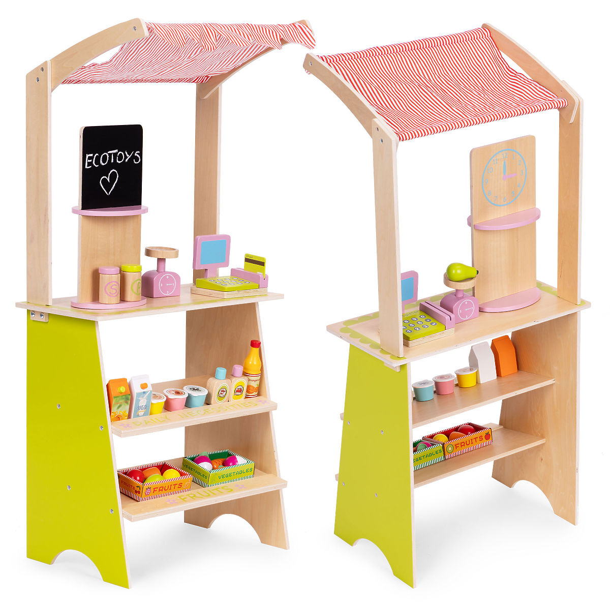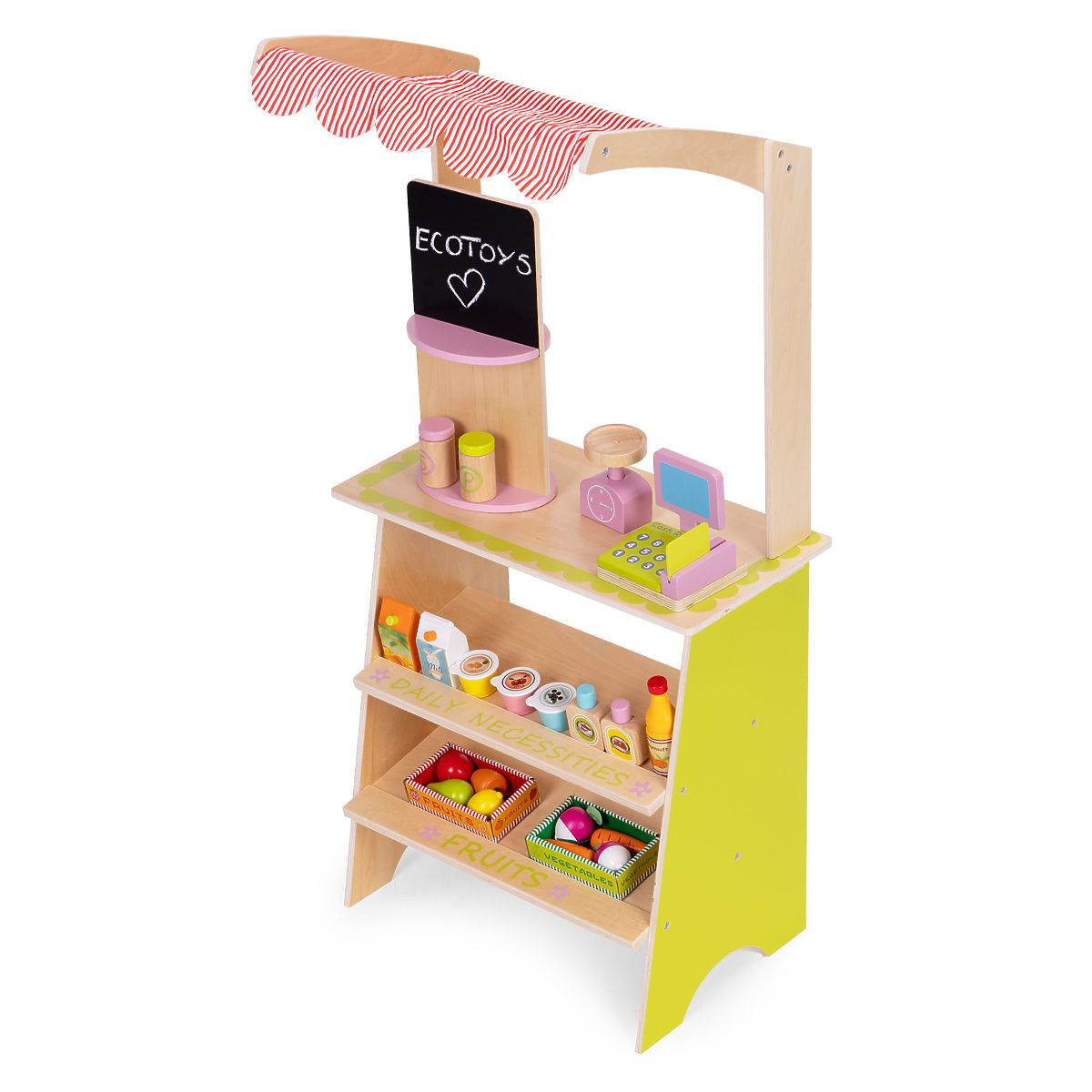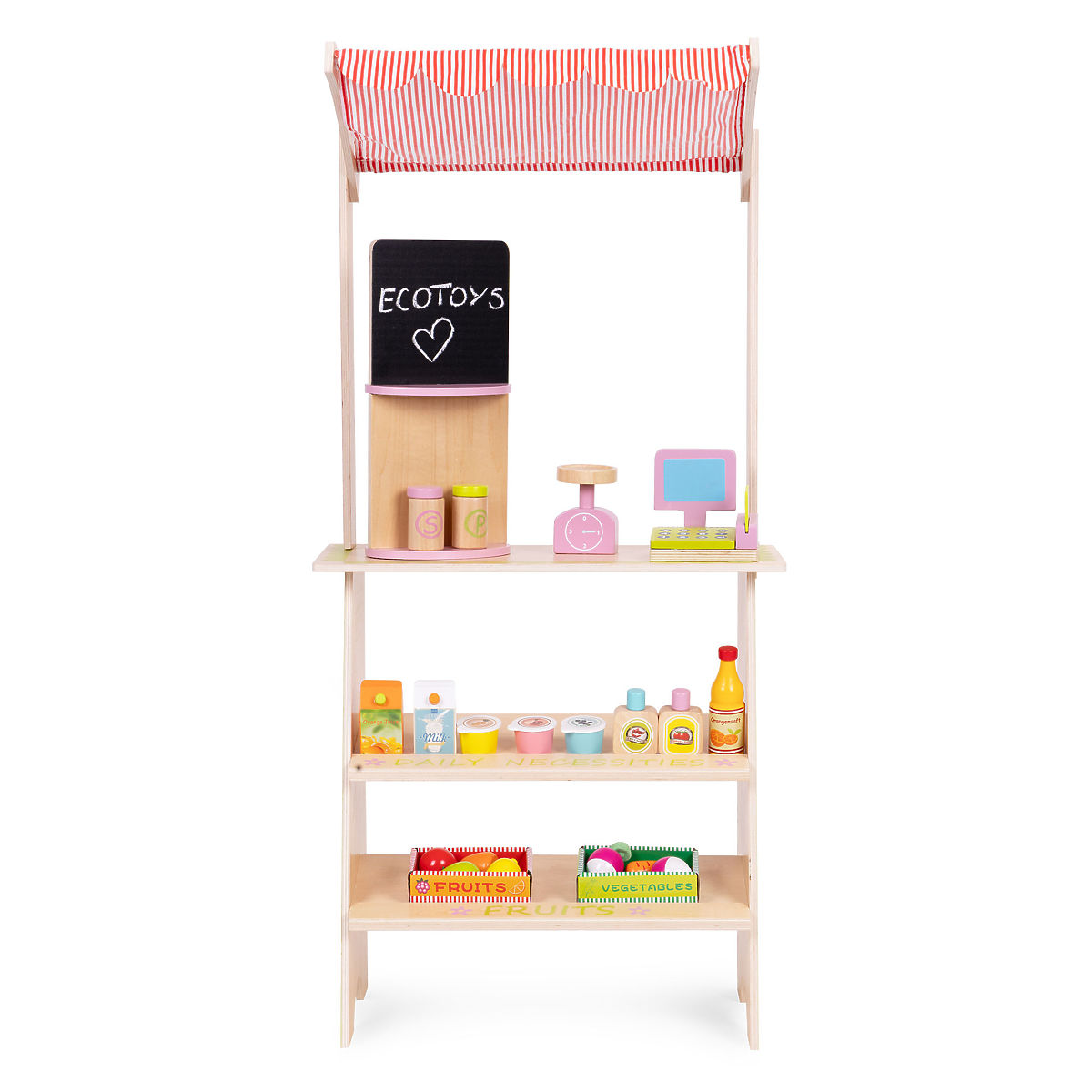 Lesena stojnica ECOTOYS spodbuja otroke k aktivni igri vlog, uči osnovnega socialnega vedenja, kot so nakupovanje, prodaja in štetje. Igrača je idealna tako za dom, kot za vrtec ali igralnico. Je odlično orodje za učenje sodelovanja, komunikacije in ustvarjalnega razmišljanja. Zaradi prisotnosti blagajne, terminala, tehtnice in številnih prehrambenih izdelkov postane igra realistična in hkrati privlačna. Izdelek razvija koordinacijo roka-oko, spodbuja domišljijo in spodbuja otroka k samostojnemu delovanju.