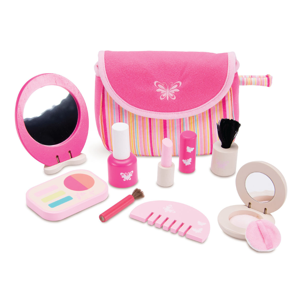 Ta rožnati komplet s ličili bo navdušil vsakega otroka, ki se rad ureja. Ličenje in posnemanje svojih najljubših idolov je s tem kompaktnim, a bogatim setom dobesedno otroška igra. Otroci se lahko na zabaven način naučijo družabnih veščin in navad. Vsa ličila so shranjena v izvirni, ljubko črtasti torbici, okrašeni z ikono metulja. Deli so izdelani iz trpežnega masivnega lesa in omogočajo enostavno uporabo majhnim otroškim rokam. Glavne lastnosti: torbica, ogledalo, glavnik, puder, paleta, šminka, lak za nohte in 2 čopiča, praktična in kompaktna embalaža, trpežna lesena izvedba
