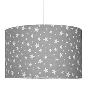 Siva tekstilna svetilka, okrašena z večjimi in manjšimi zvezdami v beli barvi. Idealna razsvetljava za otroško sobo z višjim stropom.