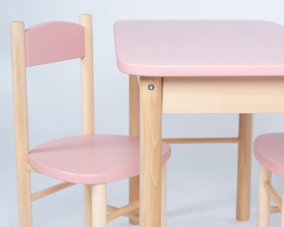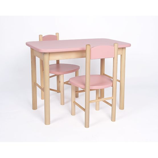V nobeni otroški sobi ne smeta manjkati otroška miza in stol. Ta komplet lesene mizice in stolčkov v pudrasto rožnati barvi bo predstavljal popoln prostor za igranje, risanje, malico ali druženje s prijatelji.