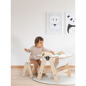 Praktična mizica s stolčkom, ki se v trenutku spremeni v tablo za risanje. Miza ima tudi leseno palico za rolo papirja, ki je pritrjena na noge mize. Vaš otrok lahko tako brezskrbno ustvarja kreativne risbe.