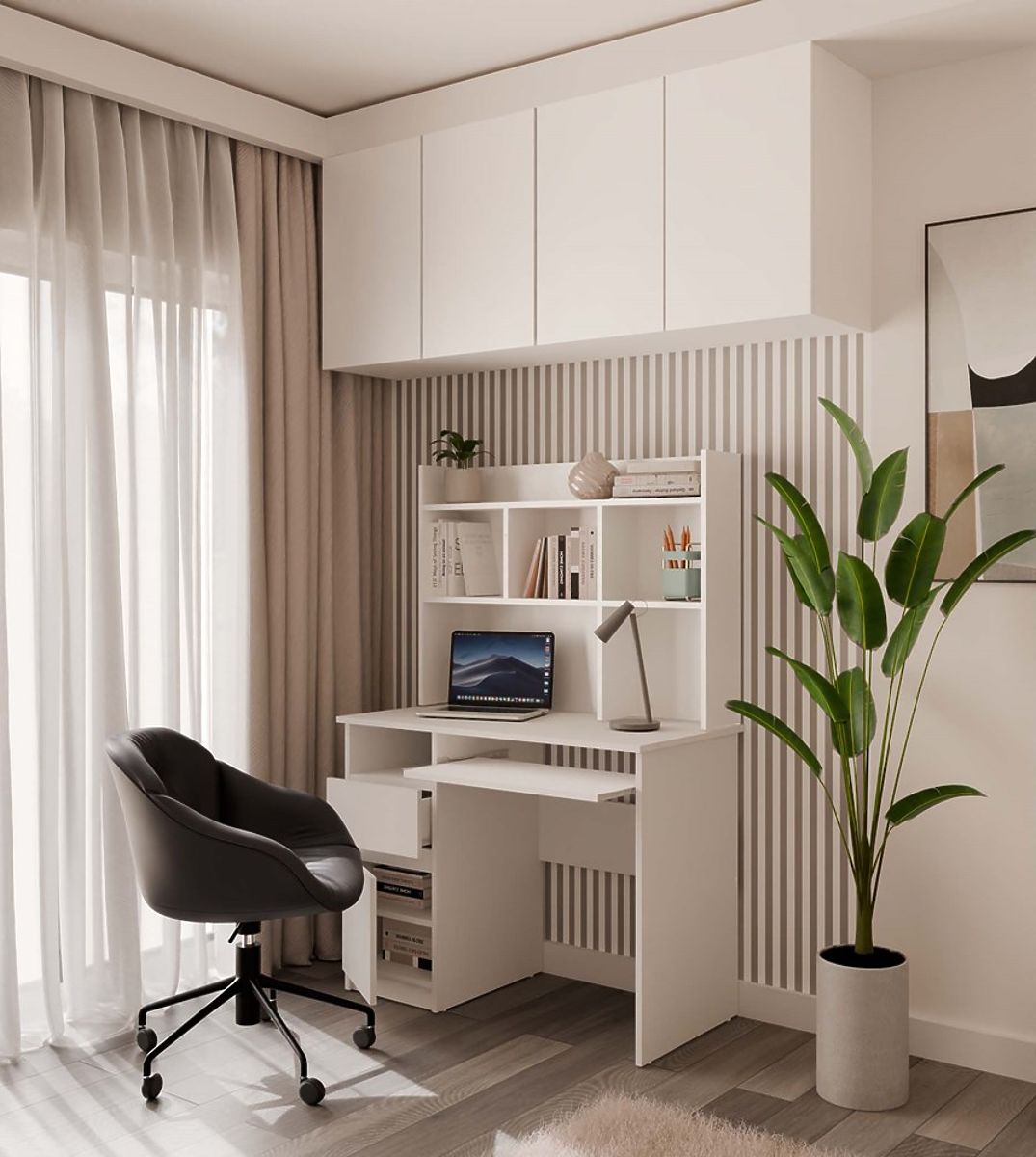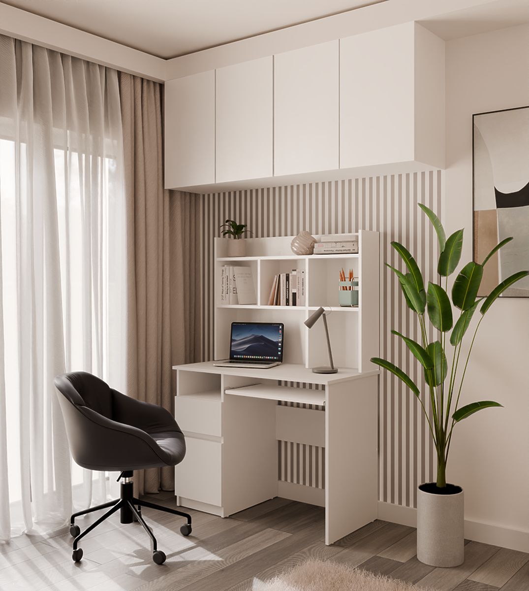 Sodobna oblika, mat bela barva in praktična razporeditev za shranjevanje omogočajo, da se pohištvo odlično znajde tako v mladinski, otroški sobi kot tudi v domači pisarni.