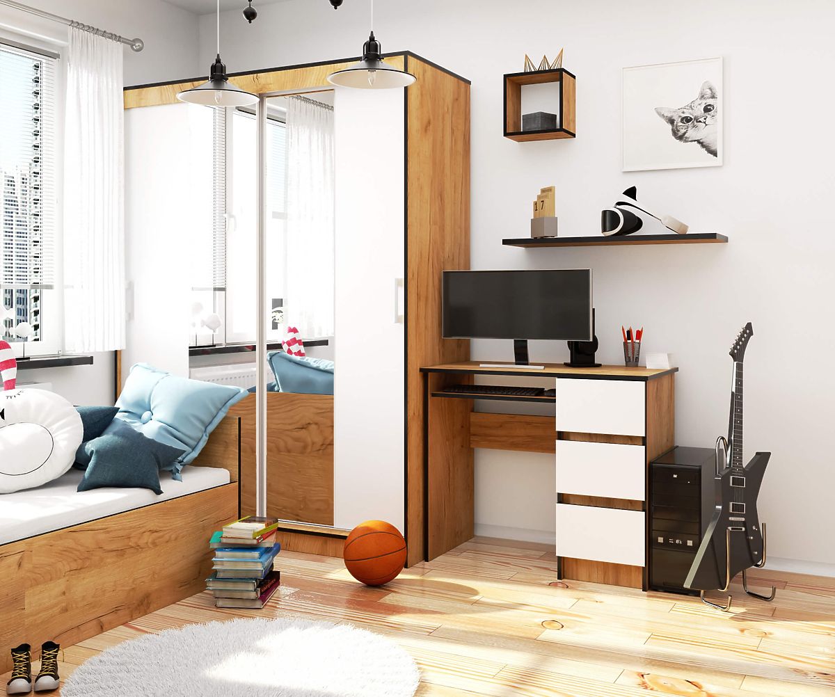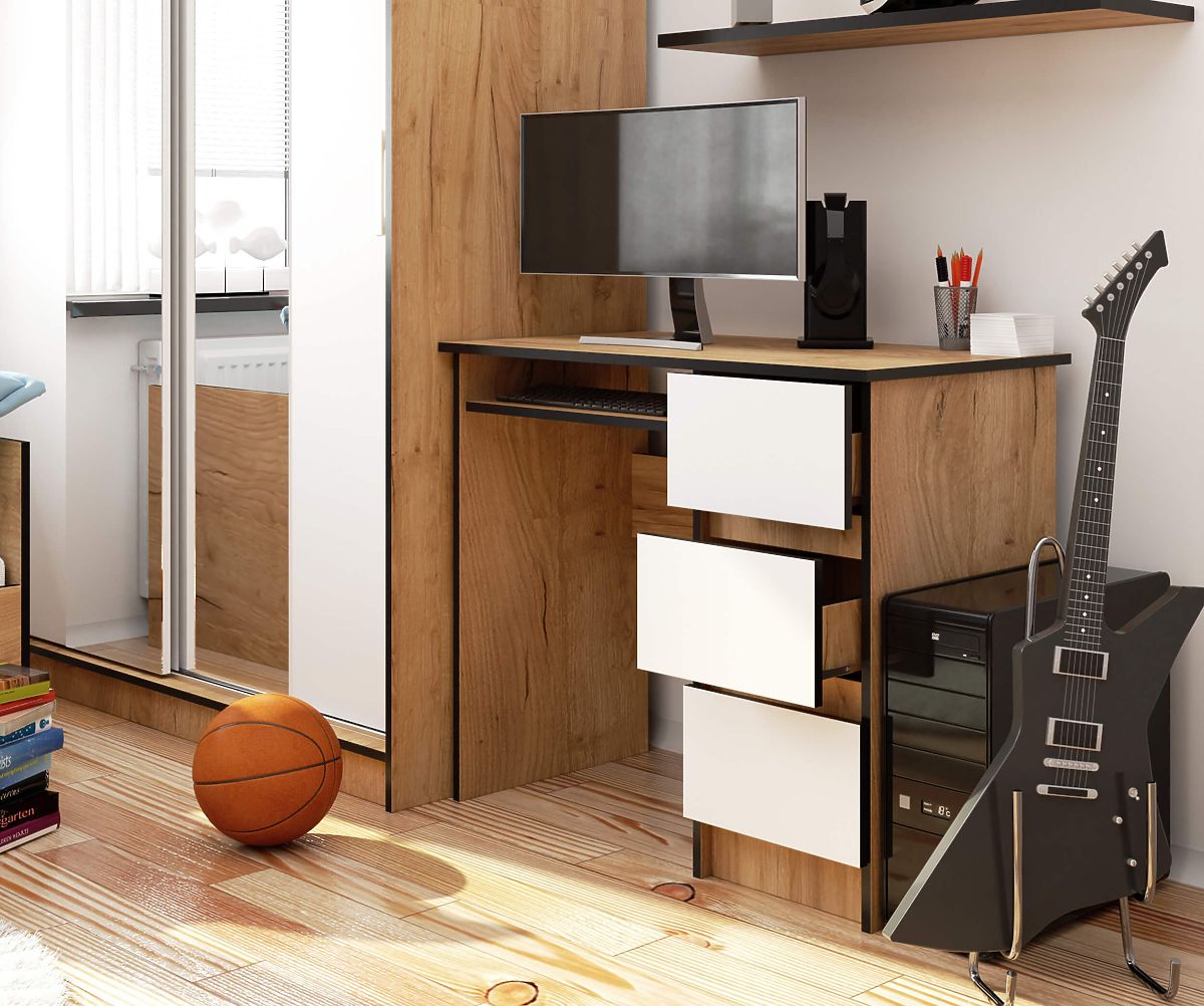 Pisalna miza A-6 dolžine 90 cm v odtenku hrast craft z belimi frontami se zaradi svojega univerzalnega in brezčasnega videza odlično prilega tako klasičnemu kot modernemu interierju otroške ali mladinske sobe. Uporablja se lahko tudi kot del opreme domače pisarne. Vse je odvisno od individualnih potreb in preferenc uporabnika. S tremi praktičnimi predali pridobite dodaten prostor za shranjevanje različnih stvari, ki jih želite imeti pri roki.
