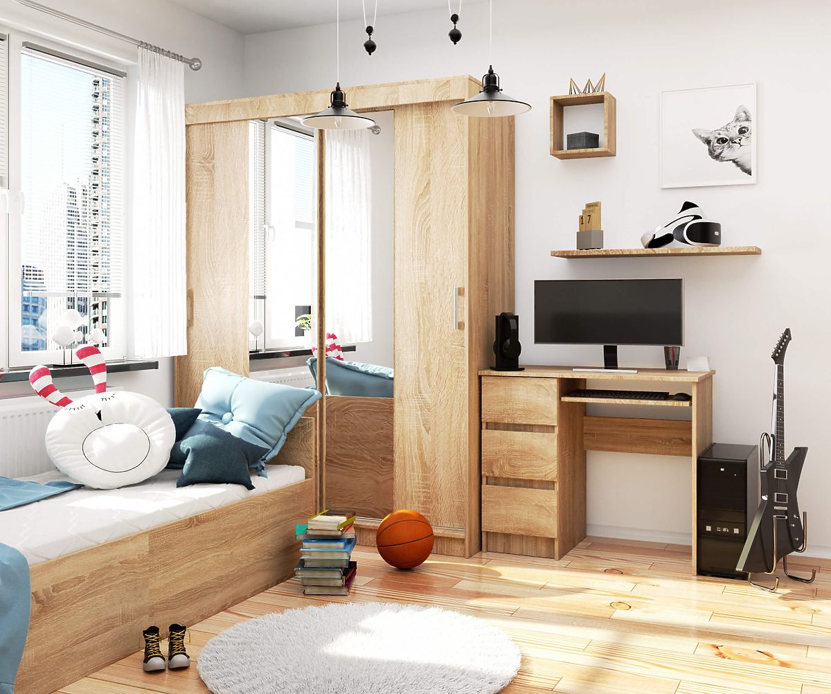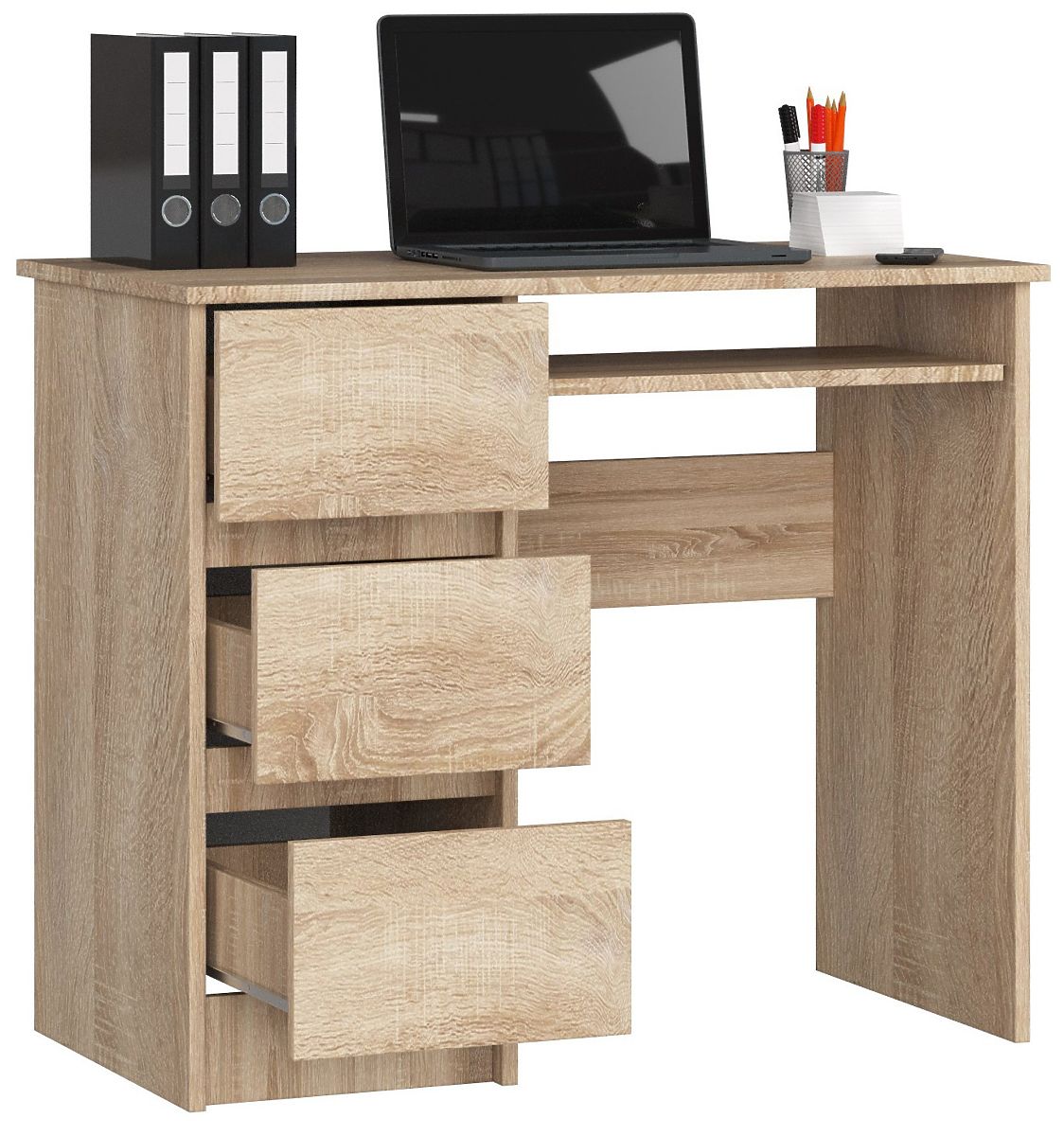 Za tiste, ki iščejo funkcionalno pisalno mizo manjših dimenzij, je naša ponudba lahko zanimiva. Predstavljena računalniška miza A-6 SONOMA levostranska ima dolžino 90 cm, višino 77 cm in globino 50 cm, njena teža pa je 30 kg. Material je visoko kakovostna laminirana plošča, zaradi česar je izdelek odporen proti obrabi. Vidni robovi mize so opremljeni z ABS robom, kar zagotavlja, da pohištvo ni enostavno poškodovano. Miza ponuja tudi veliko prostega prostora, ki ga je mogoče poljubno urediti in uporabiti. To omogočajo tri predali - v vsakem izmed njih je ena polica. Miza vsebuje tudi polico za tipkovnico, ki se premika lahkotno in prosto. To omogočajo kovinski valjčni vodila.