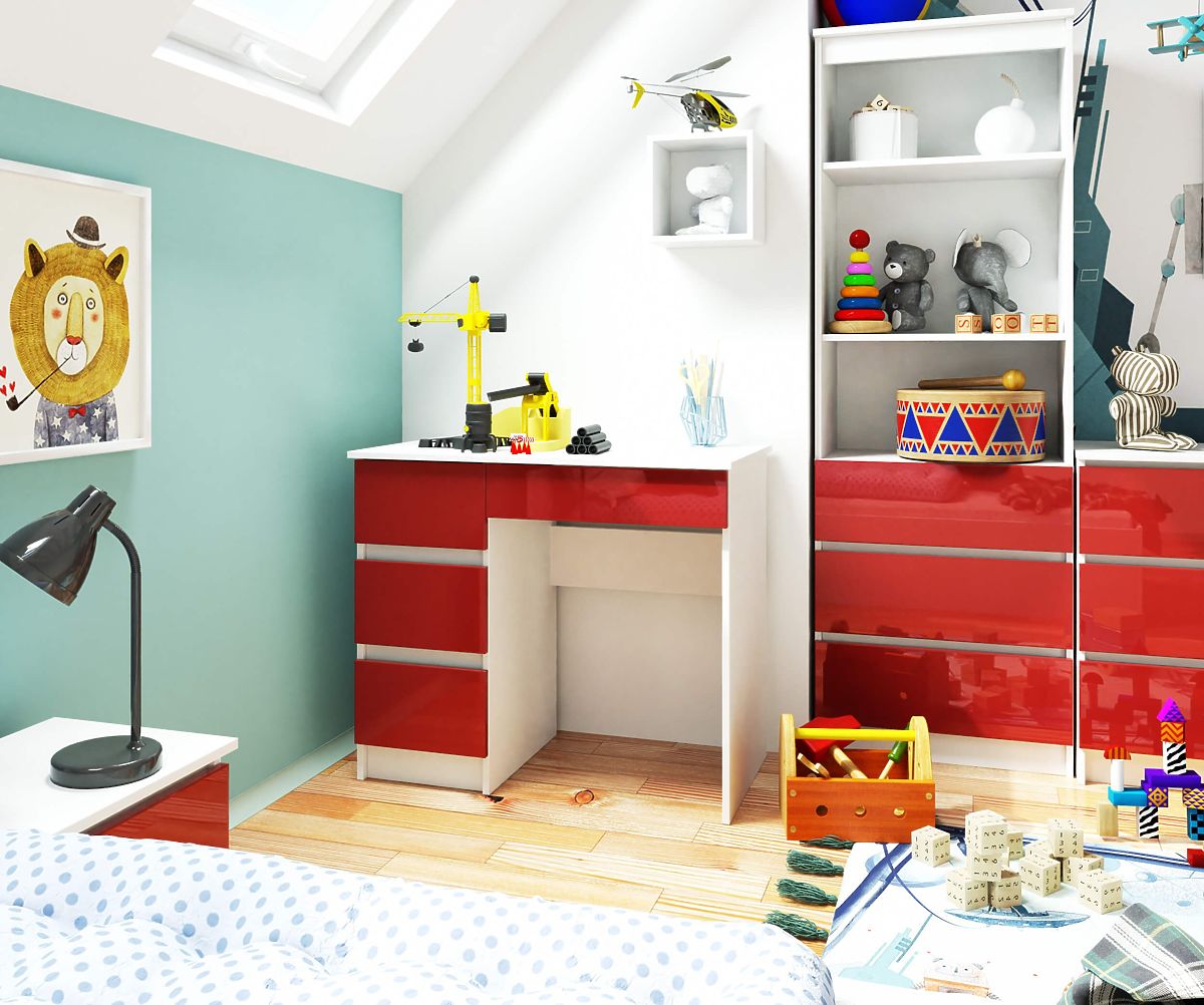 Neobičajna barva mize pritegne pozornost, njena funkcionalnost pa zagotavlja, da bo ta izdelek izpolnil pričakovanja tudi najzahtevnejših uporabnikov. Pohištvo združuje belo ohišje in efektne rdeče sijajne čelne površine, ki naredijo mizo izjemno. Je primerna izbira za majhne prostore zaradi kompaktnih dimenzij konstrukcije. Računalniška miza A-7 90 cm (leva) je sestavljena iz štirih predalov. Uporablja se predvsem v otroških in mladinskih sobah, pa tudi v sodobno opremljenih pisarnah.